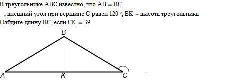 ∠ВСК=180-120=60°; ∠СВК=90-60=30°; ВС=2КС=39*2=78 по свойству катета, лежащего против угла 30°.