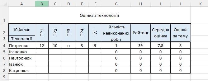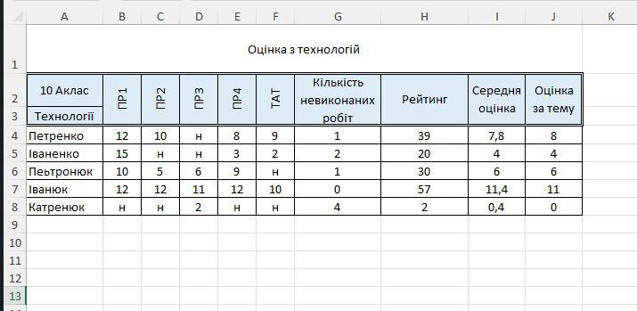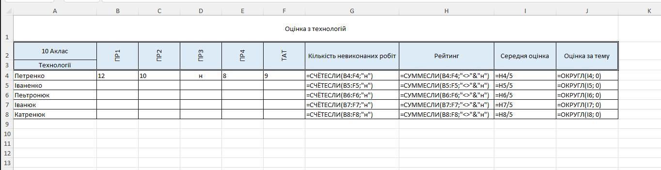 У новому аркуші з іменем "Оцінка з технологій" створити таблицю оцінок учнів за лабораторні роботи та тематичну атестацію з теми "Тестовий редактор Word, як сучасний інструмент діловодства" за даним зразком, заповнити її. Серед оцінок за практичні роботи є "Н" - учень не виконував практичну роб оту. Підрахувати скільки не виконаних практичних робіт має кожен учень (СЧЁТЕСЛИ), його рейтинг без "н" (СУММЕСЛИ), середню оцінку учня з теми (рейтинг/5), оцінку за тему (ОКРУГЛ).
