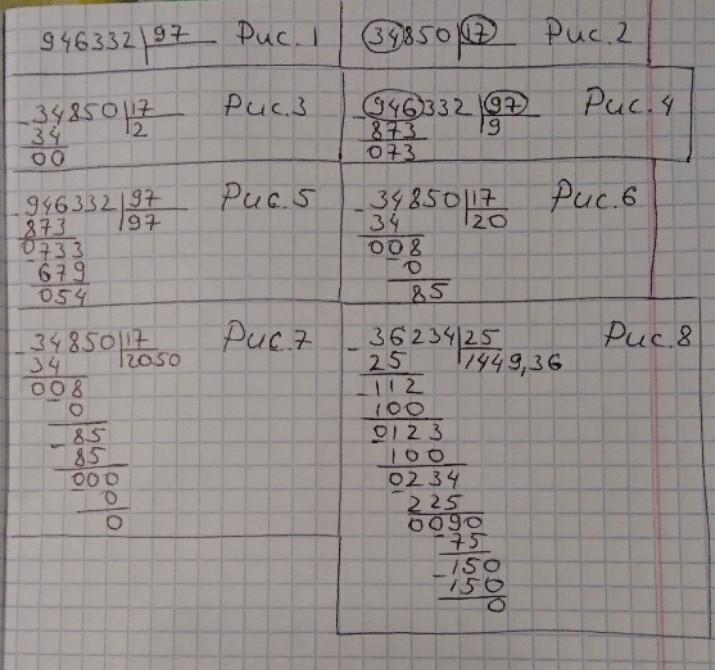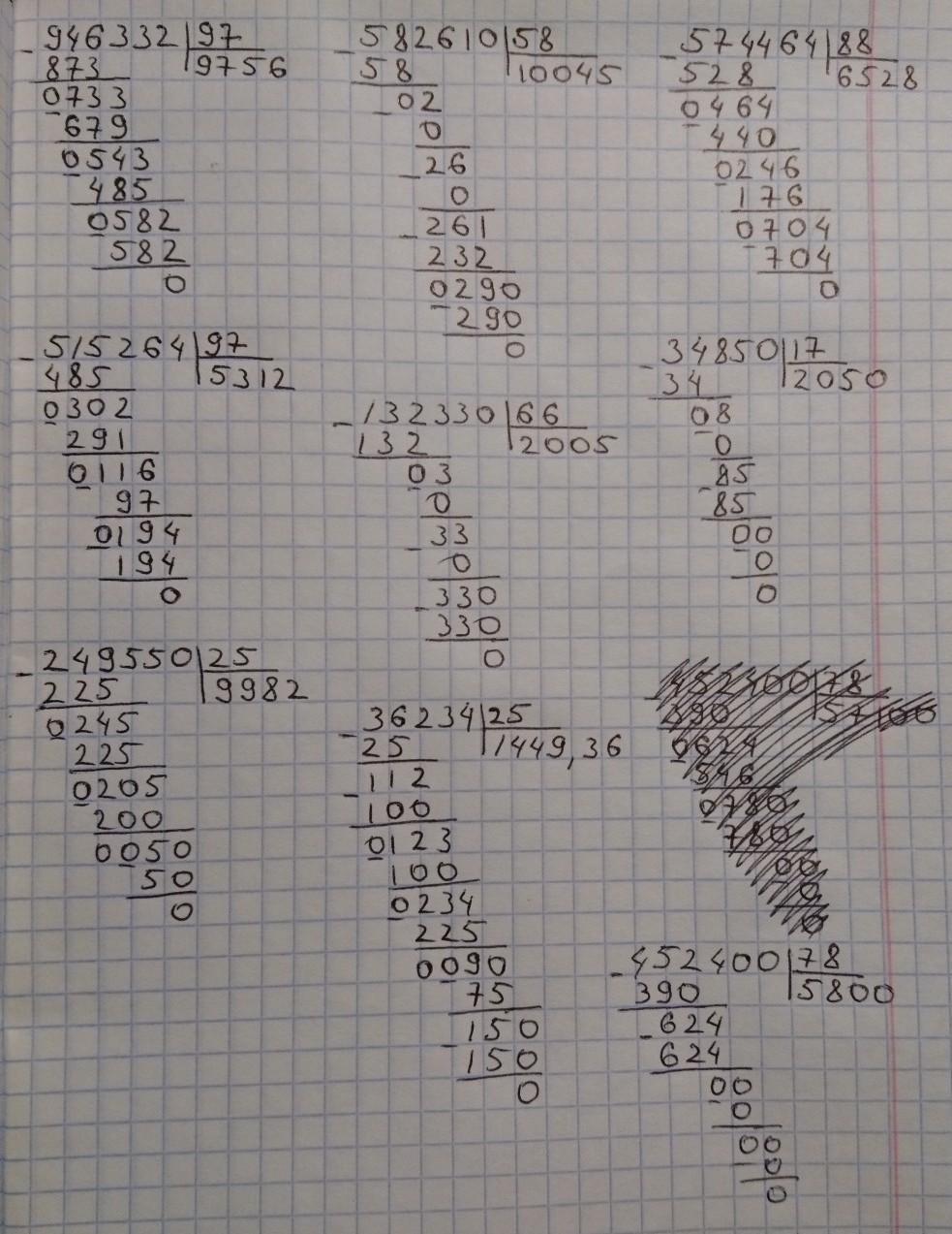 Как решить примеры на деления столбик точнее объяснения примеры:946332:97 582610:58 574464:88 515264:97 132330:66 34850:17 249550:25 36234:25 452400:78