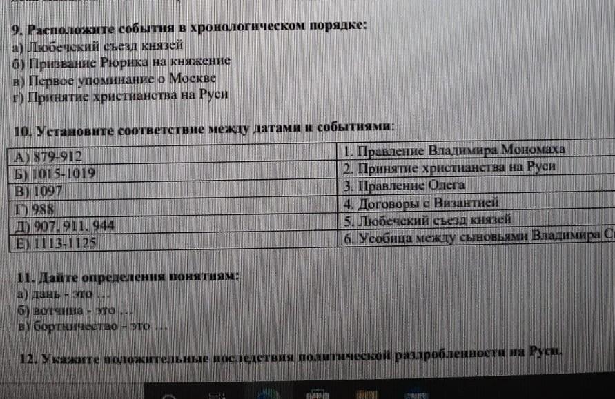 Объяснение:9) Рюрика призвали в 862, христианство в 988, любеческий съезд в 1097, упоминание о Москве в 1147