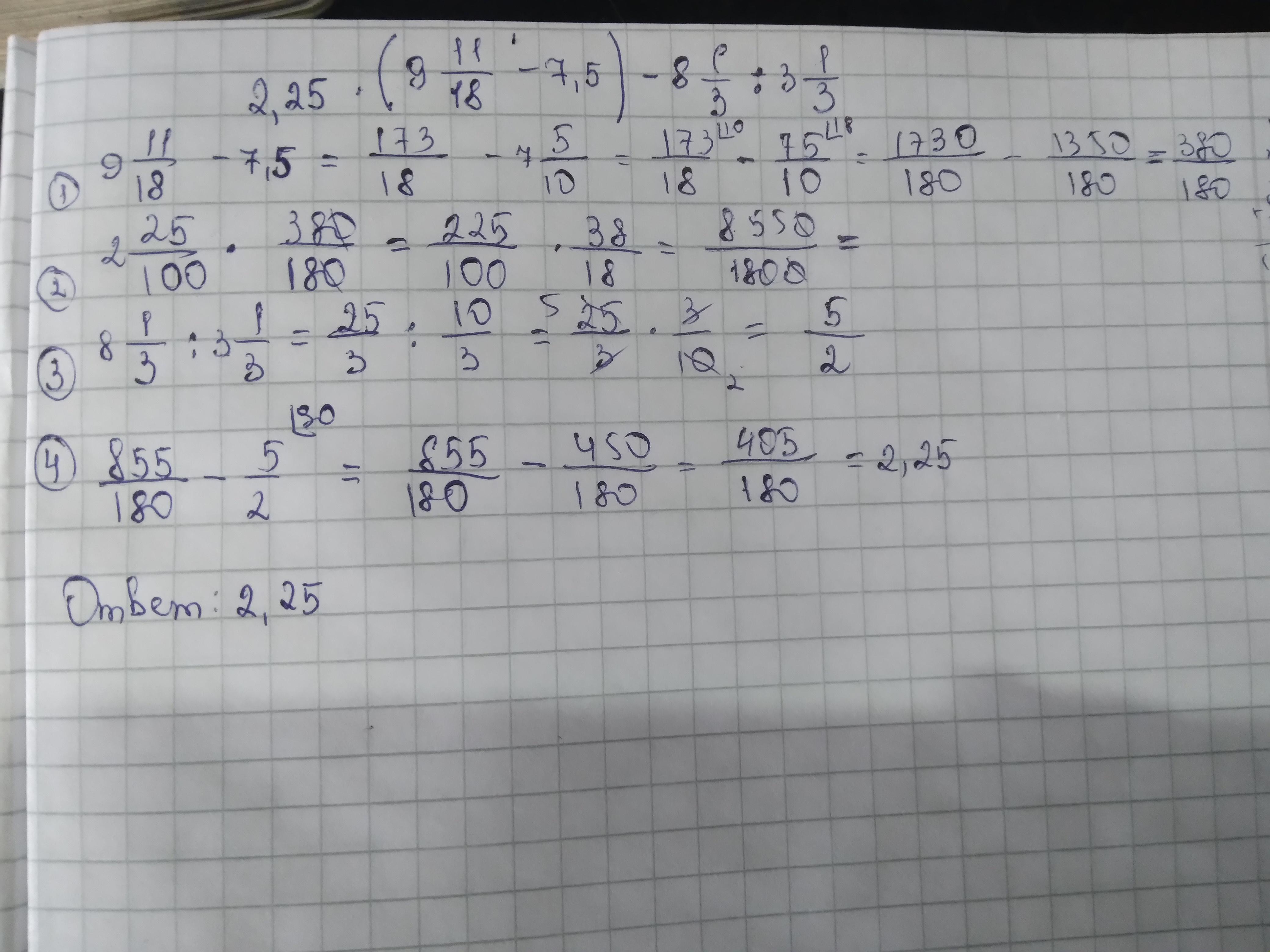 2,25×(9. 11\18 - 7,5) - 8. 1\3 ÷ 3. 1\3 = 2. 1\4