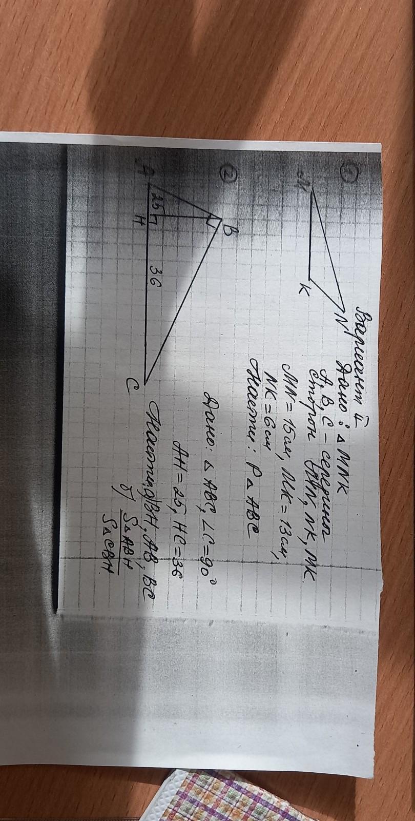 1.по определению -стороны треугольника АВС- это средние линии треугольника MNK поэтому периметр искомого треугольника в два раза меньше (15+13+6)/2=17/см/