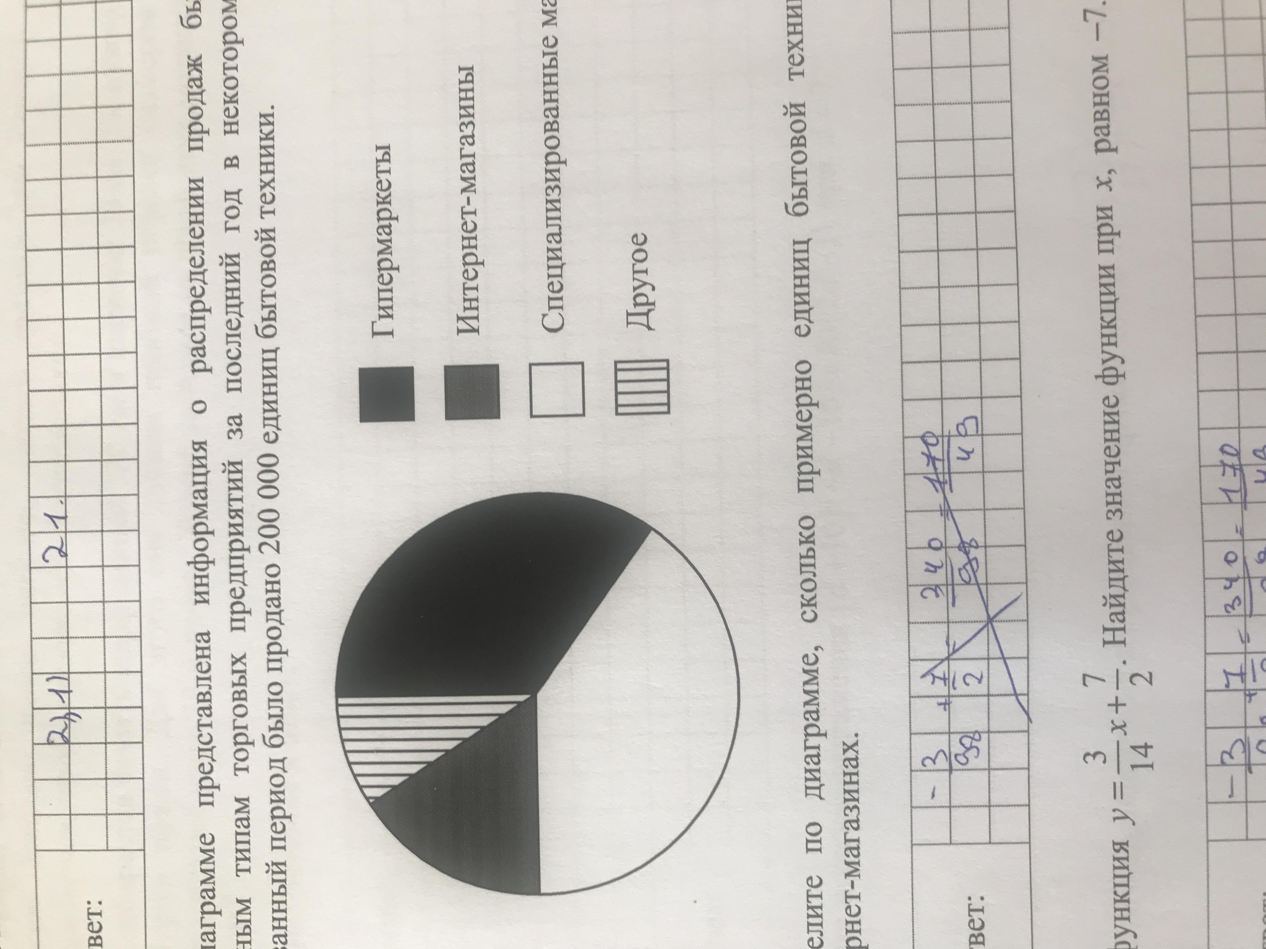 На диаграмме представлена информация о распределении продаж бытовой техники по разным типам торговых предприятий за последний год в некотром городе, всего за указанныц период было продано 200000 единиц бытовой техники
