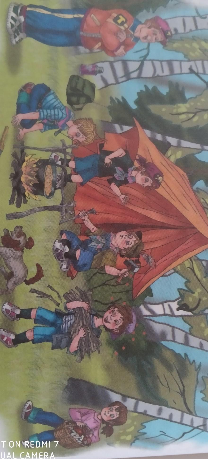 Саша смотрел как мальчики играют у костра. Там прыгала собака около них, было смешно. Костя с Андреем ставят палатку. Ваня раздувает костер. Леша приносит ветки для костра. Вася на это всё смотрел. Наступила ночь. Мы поели и легли спать. Все проснулись потому что собака начала гавкать потому что увидела ежика в кустах, и скорее всего подумала то что это волк