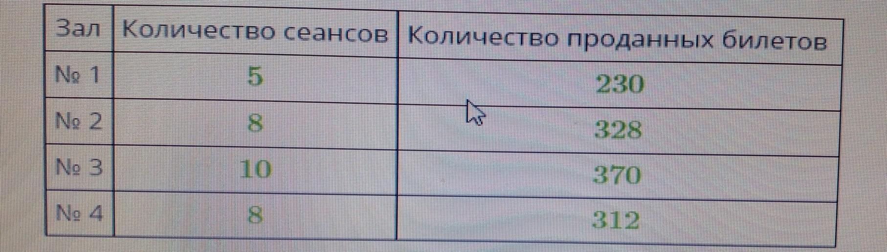 В четырёх залах кинотеатра показывают новые фильмы. В разных залах разное количество мест и разное количество сеансов в день, но все билеты распроданы. В таблице показано количество сеансов и количество проданных билетов. Сколько мест в самом Вместительном зале?