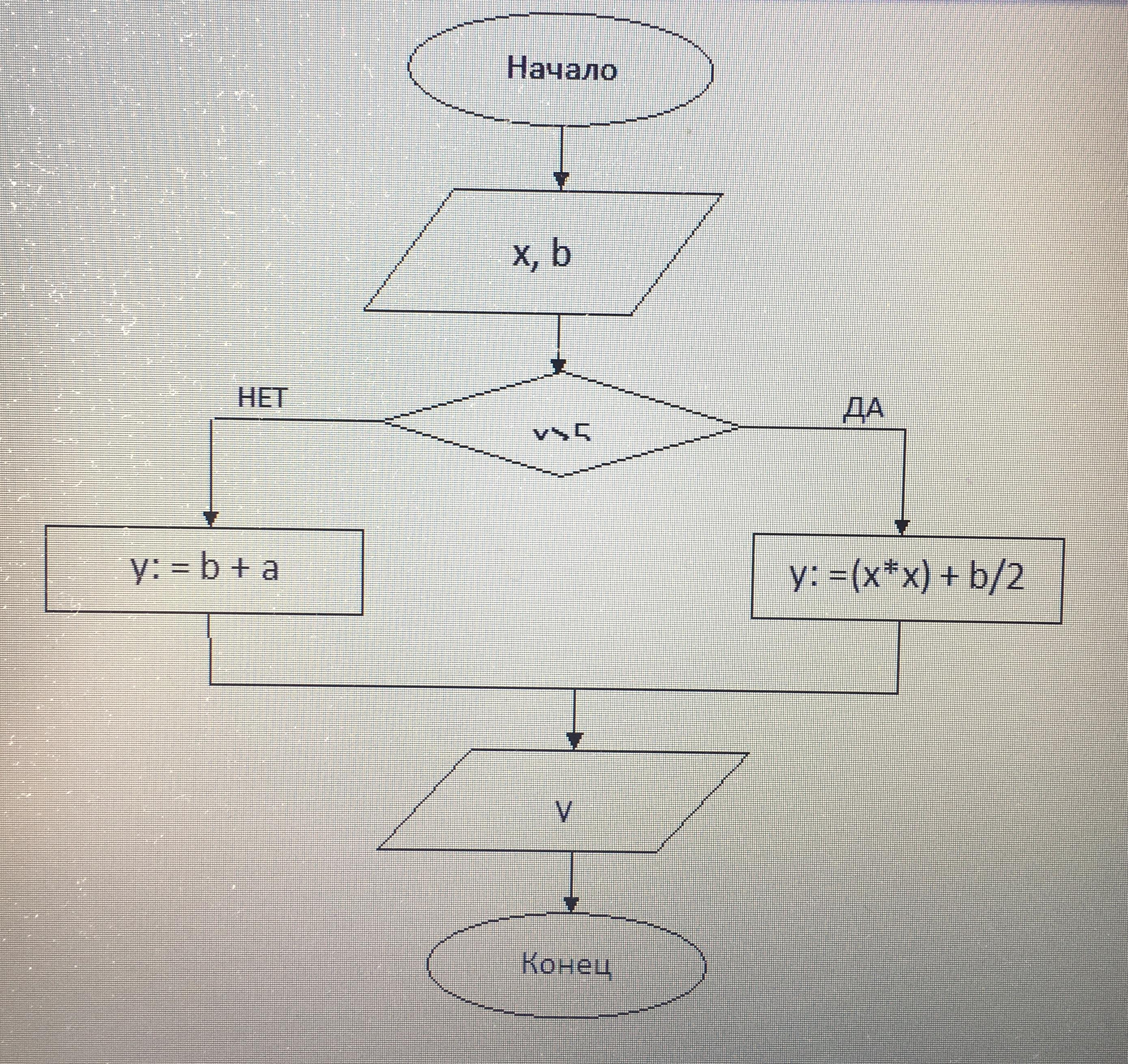 иначе (если условие x > 5 ложное (нет)) вычисляем переменную y по формуле b + x