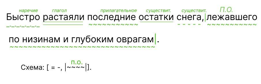 сентаксический разбор предложения Быстро растаяли последние остатки снега лежавшего по низинам и глубоким оврагам