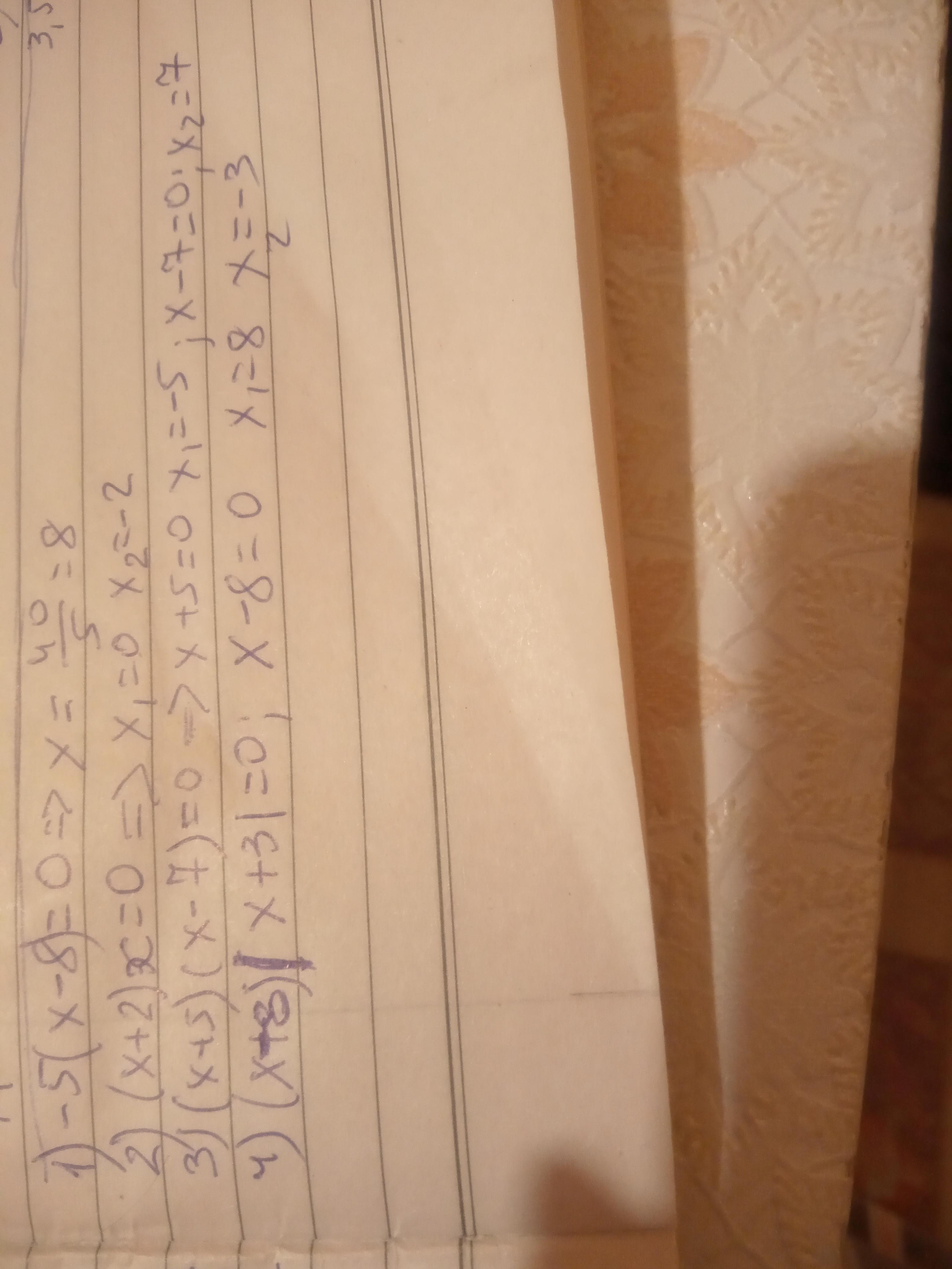 Будь ласка допоможіть, не розумію як робити 1)-5(х-8)=0 ; 2)(х+2)х=0 ; 3)(х+5)(х-7)=0 ; 4)(х-8)Iх+3І=0 .