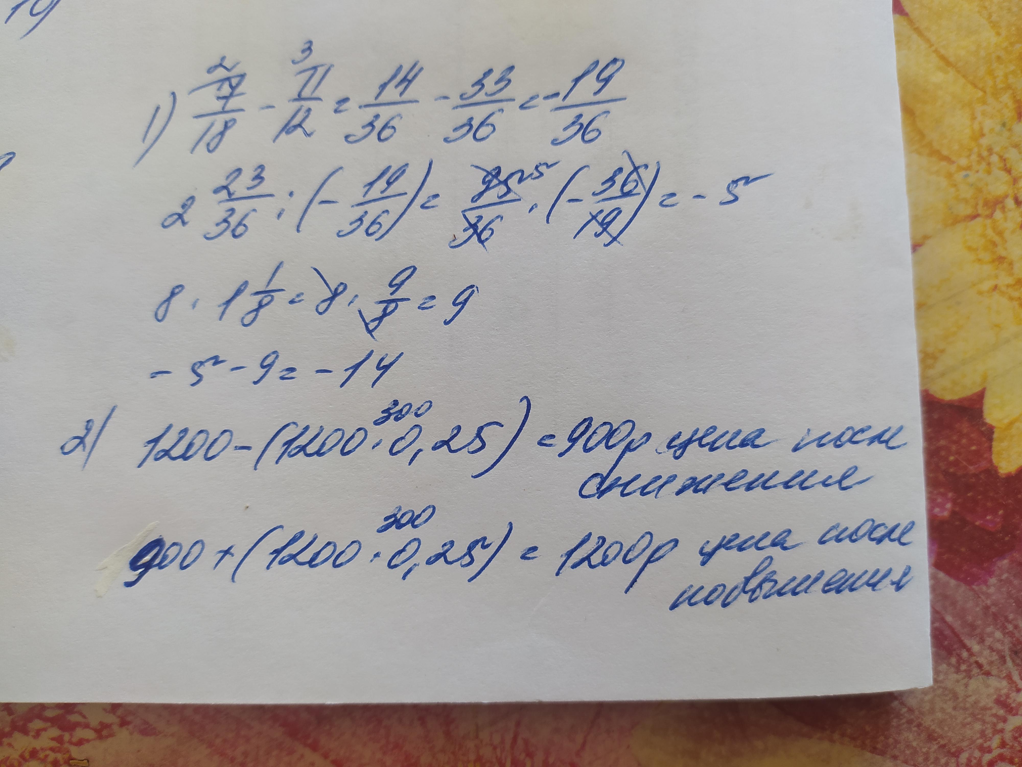 1. Вычислите: 2 23/36 : (7/18 - 11/12) - 8 * 1 1/8. Запишите решение и ответ.