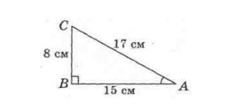 Рассмотрим рисунок. На рисунке задан Δ АВС - прямоугольный, так как ∠ В =90°. Катеты ВС= 8 см, АВ =15 см, а гипотенуза АС =17 см.