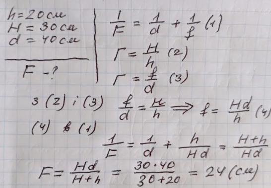 Предмет висотою 20 см розміщений на відстані 40 см від збиральної лінзи. Визначте фокусну відстань лінзи, якщо висота зображення 30 см.
