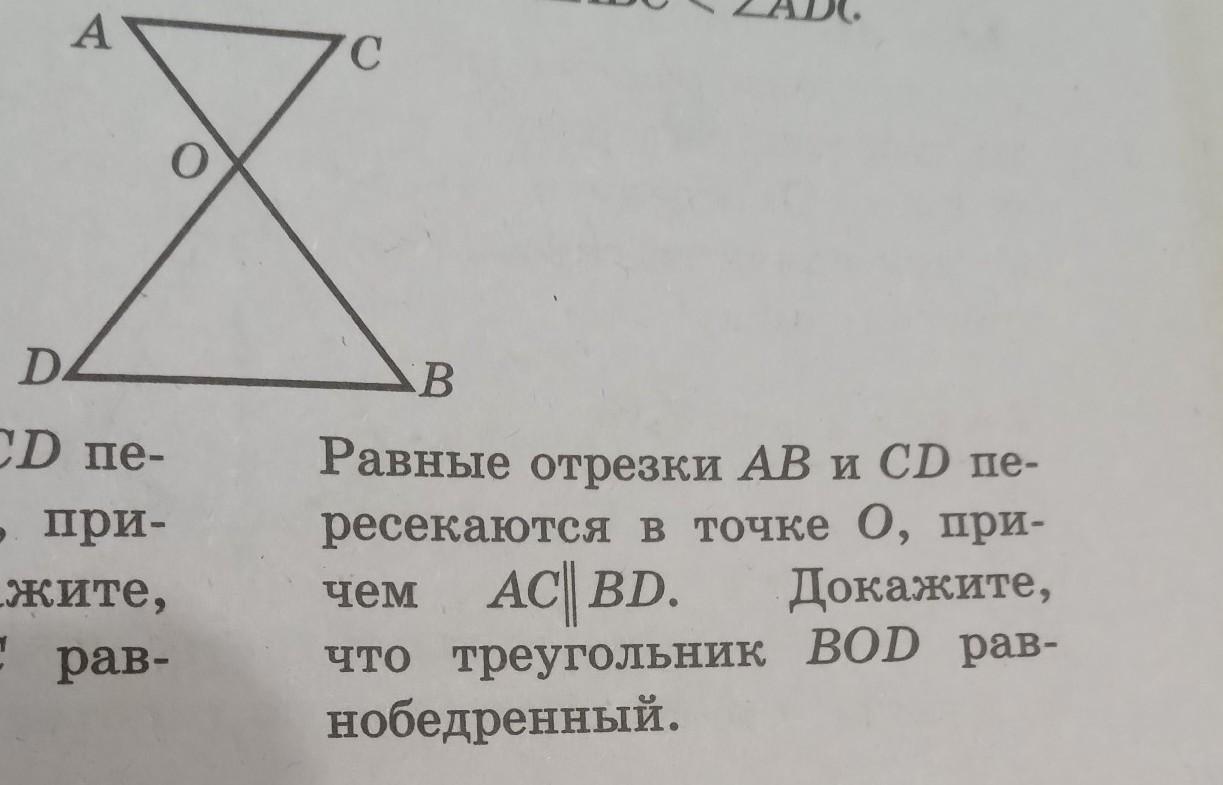 Рассмотрим треугольники АОС и ВОD. У них угол АСО = углу ВDО, так как это накрест лежащие углы для параллельных прямых AC и BD, и секущей СD;