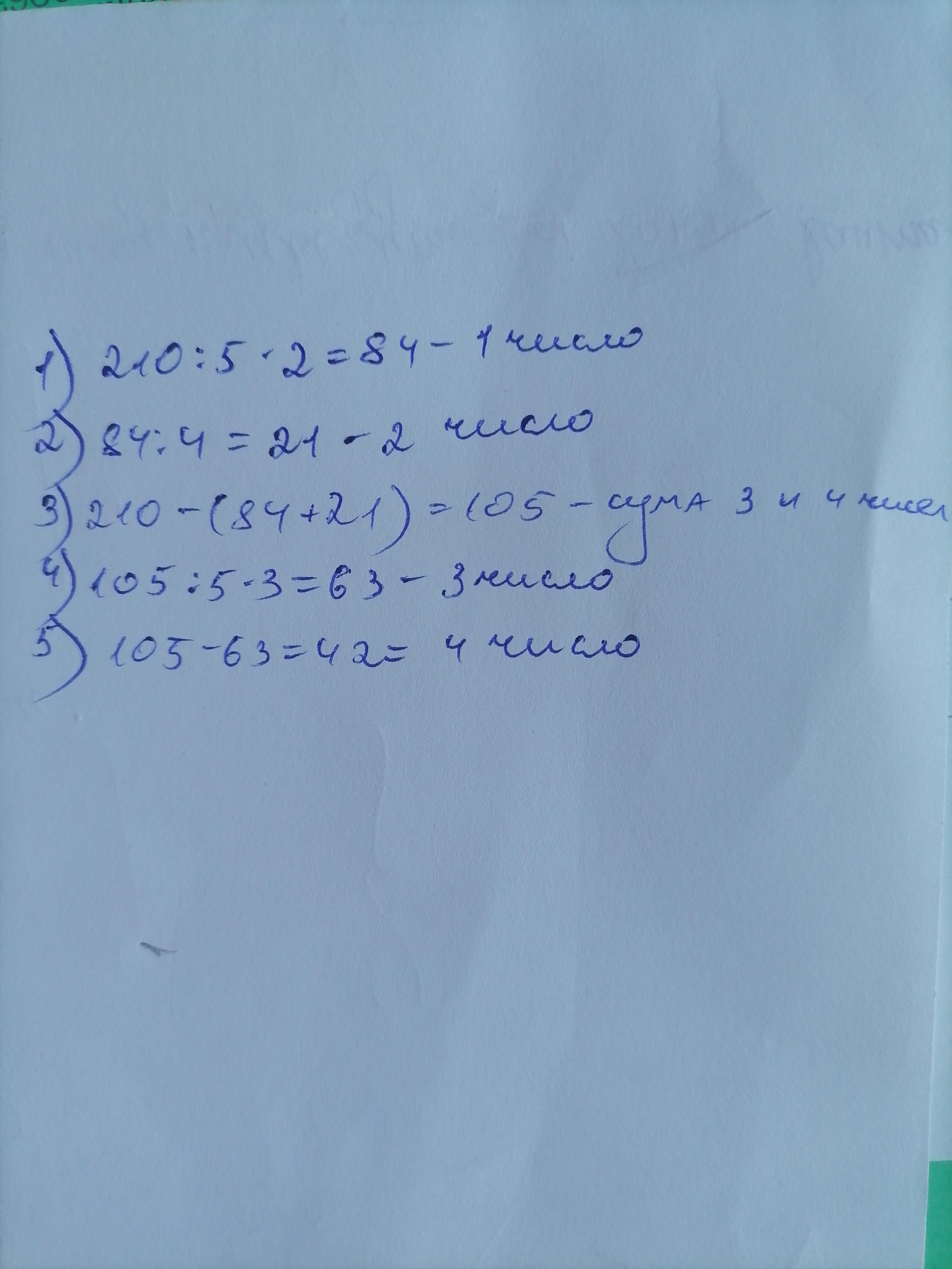 сумма четырех чисел 210,первое число составляет 2/5 этой суммы ,второе -1/4 от первого числа ,а третье число 3/5 от суммы оставшихся двух чисел .найдите эти числа.