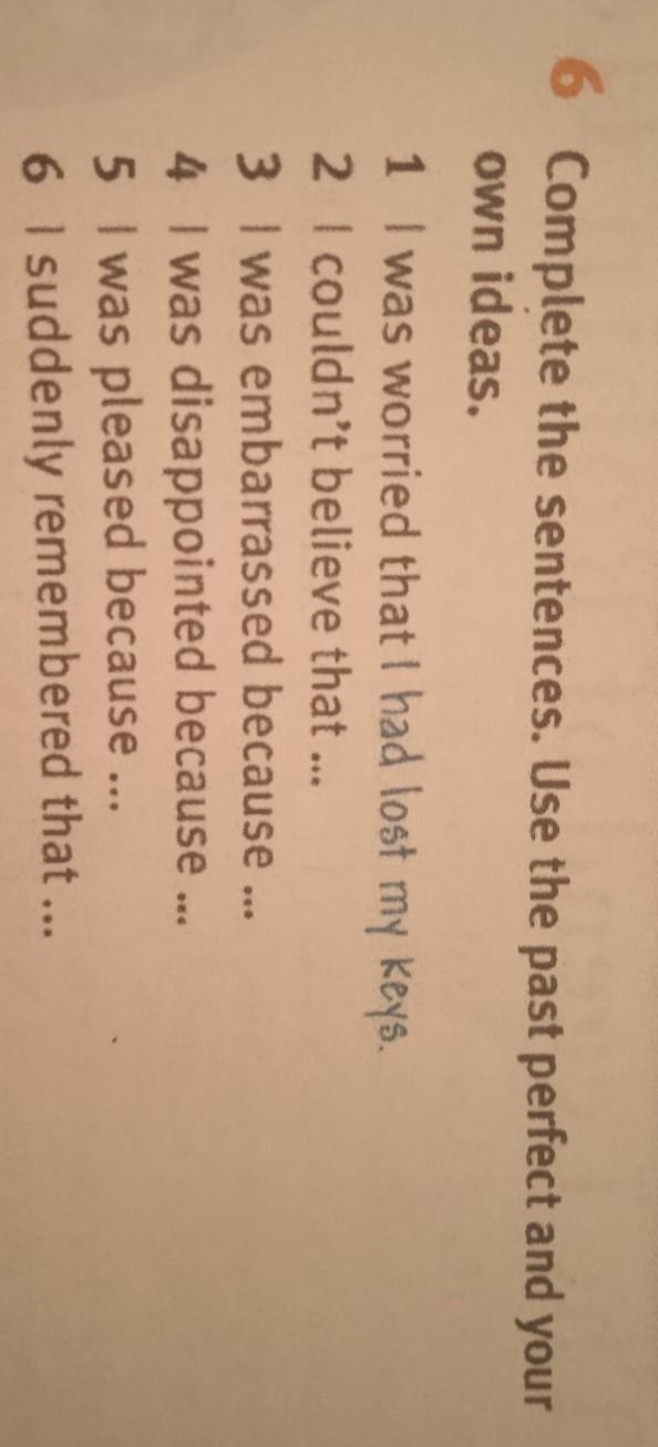 6 Complete the sentences. Use the past perfect and your own ideas. 1 I was worried that I had lost my keys. 2 I couldn't believe that ... 3 I was embarrassed because ... 4 I was disappointed because ... 5 I was pleased because ... 6 I suddenly remembered that ...