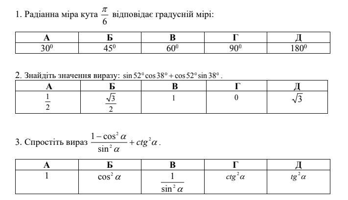 Алгебра 3 тестовых задания 10 класс, не сложные сделайте пожалуйсто! заранее спасибо даю 50 балов (1-3)