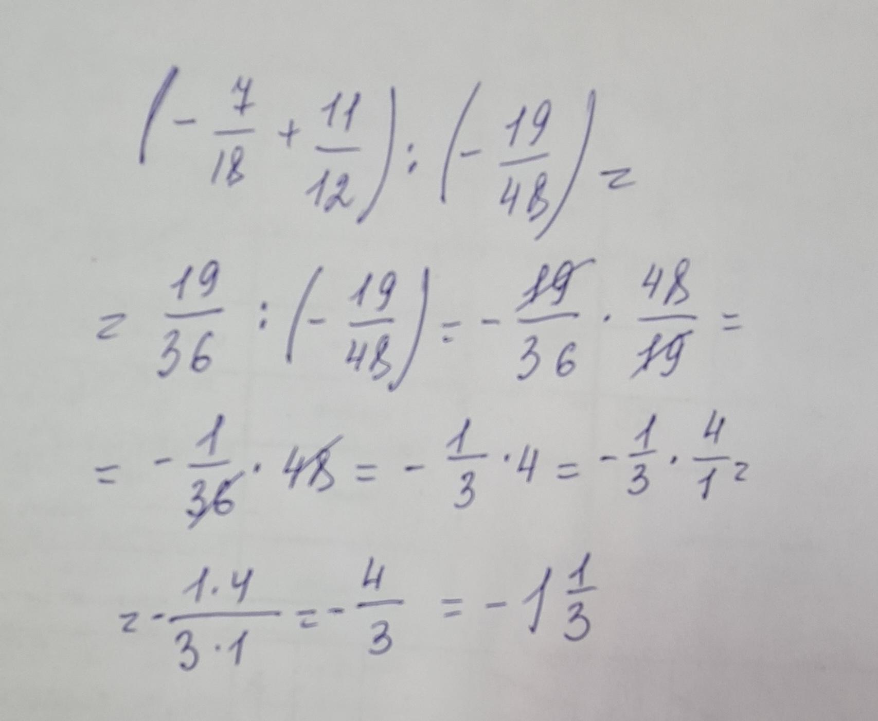 =(-14/36+33/36)*(-48/19)=19/36*(-48/19)= - 8/6= - 1 1/3