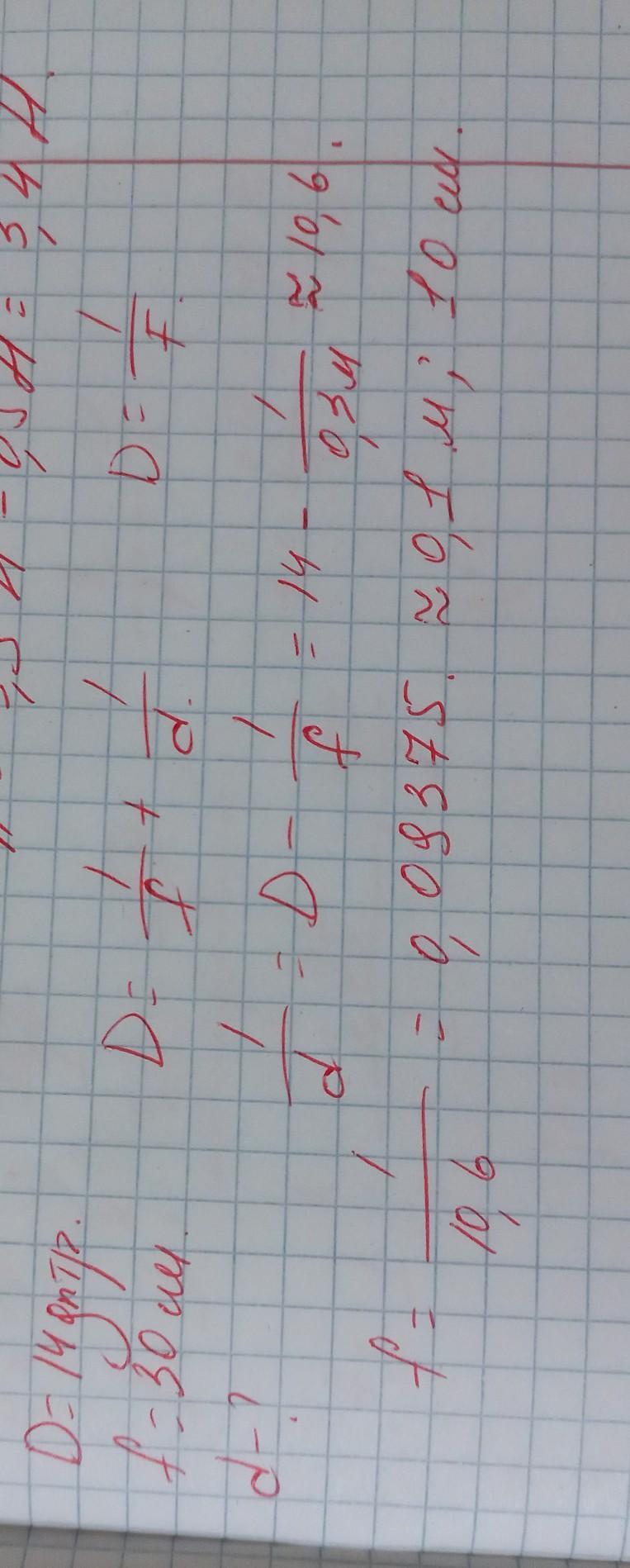 Известно, что оптическая сила линзы равна 14 дптр. Изображение находится от линзы на расстоянии 30 см. Определите на каком расстоянии от линзы находиться предмет, дающий это изображение.