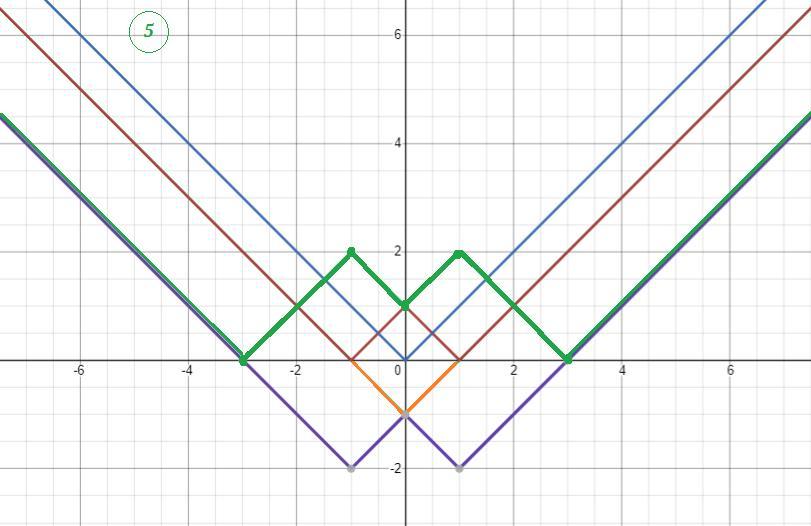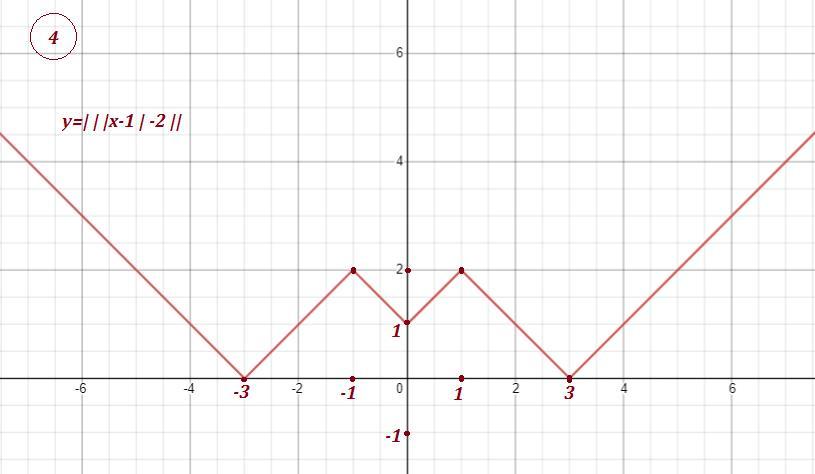 Чтобы получить график функции , надо отобразить ту часть предыдущего графика, которая находится ниже оси ОХ, в верхнюю полуплоскость. Получим график с 5 углами, координаты которых в точках (-3,0) , (3,0) , (-1,2) , (1, 2) , (0,1) . См. рисунок 4 .