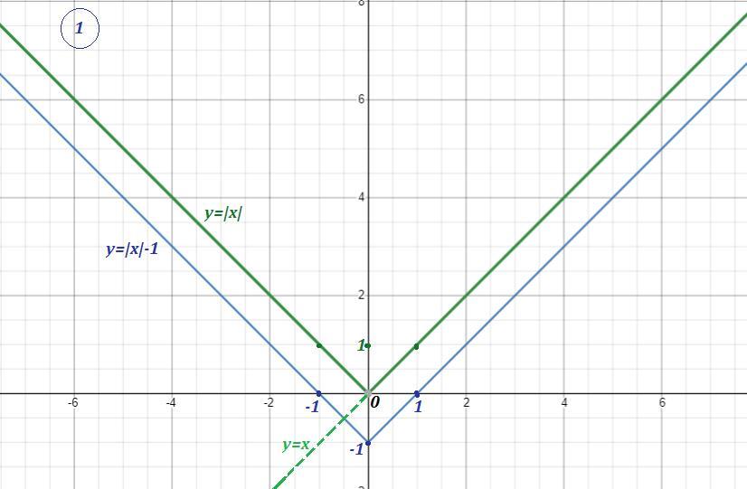 Строим график y=|x| . Для этого строим прямую у=х и отображаем ту часть прямой, которая находится ниже оси ОХ, в верхнюю полуплоскость ( получим угол с вершиной в (0,0) .