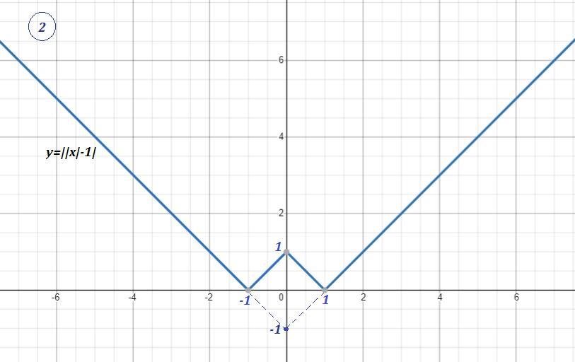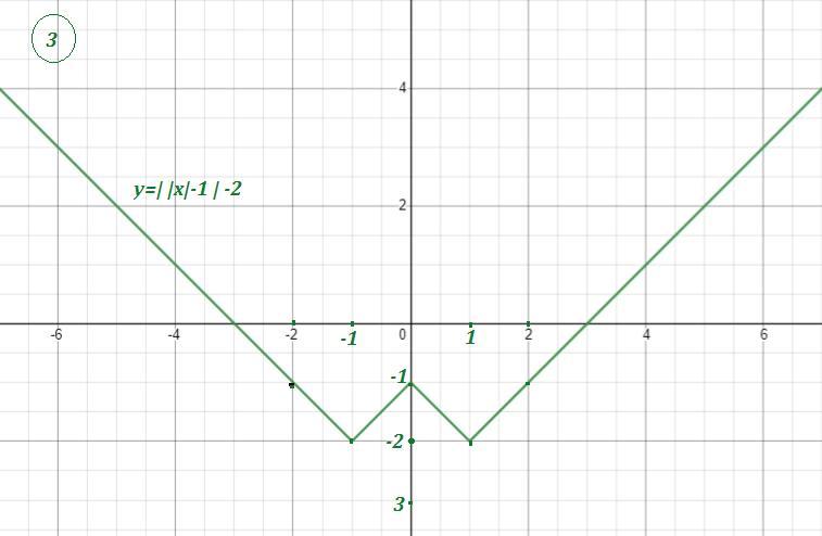 Чтобы получить график функции , надо сдвинуть предыдущий график на 2 единицы вниз вдоль оси ОУ . Вершины углов будут в точках (-1,-2) , (1,-2) , (0,-1) . См. рисунок 3 .