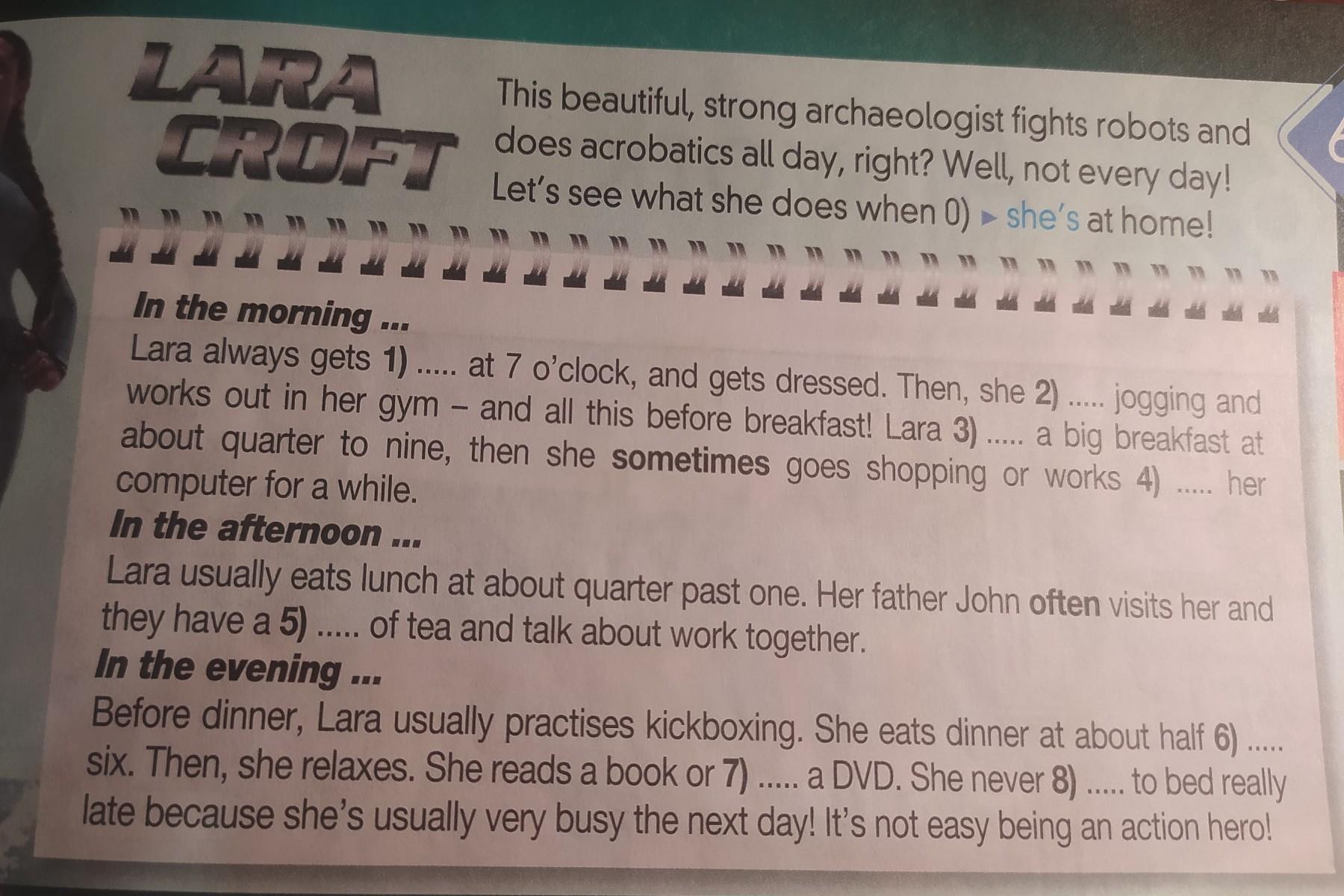 This beautiful, strong archaeologist fights robots and does acrobatics all day, right? Well , not every day! Let's see what she does when 0) she's at home! Home In the morning ... Lara always gets 1) ..... at 7 o'clock, and gets dressed. Then, she 2) ..... jogging and works out in her gym - and all this before breakfast! Lara 3) ..... a big breakfast at about quarter to nine, then she sometimes goes shopping or works 4) ..... her computer for a while. In the afternoon ... Lara usually eats lunch at about quarter past one. Her father John often visits her and they have a 5) ..... of tea and talk about work together. In the evening .. Before dinner, Lara usually practises kickboxing. She eats dinner at about half 6) ..... six. Then, she relaxes. She reads a book or 7). ..... a DVD. She never 8) ..... to bed really late because she's usually very busy the next day! It's not easy being an action hero!