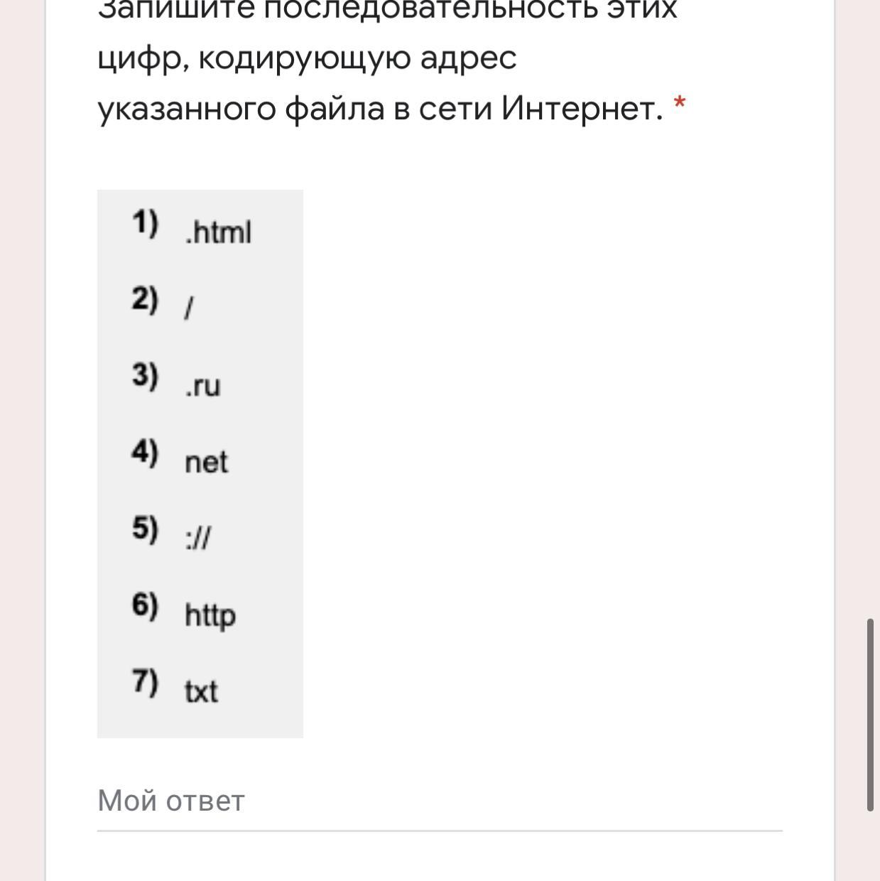 Доступ к файлу net.html, находящемуся на сервере txt.ru, осуществляется по протоколу http. Фрагменты адреса файла закодированы цифрами от 1 до 7. Запишите последовательность этих цифр, кодирующую адрес указанного файла в сети Интернет