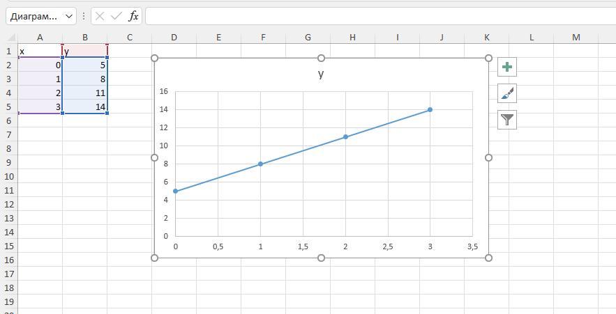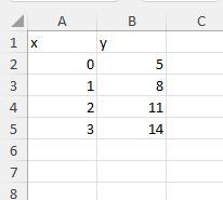 - Будуємо невиличку таблицу з координатами необхідних значень. В нашому прикладі для зручності можна взяти х = 0, х = 1, х = 2, х = 3 (див. фото №1). 1 стовпчик - для х, 2 стовпчик - для у.