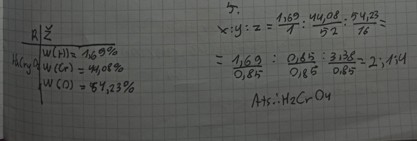 Когда даны массовые части элементов, мы просто их делим на их молярку, и получается, что 1.69 делим на 1, 44.08 делим на молярку хрома и т.д., после этого мы получаем нецелые, чтобы получить целые, мы делим эти 3 числа на самое маленькой, коем является 0.85, а потом получаем количество атомов H2CrO4(Хромовая кислота)