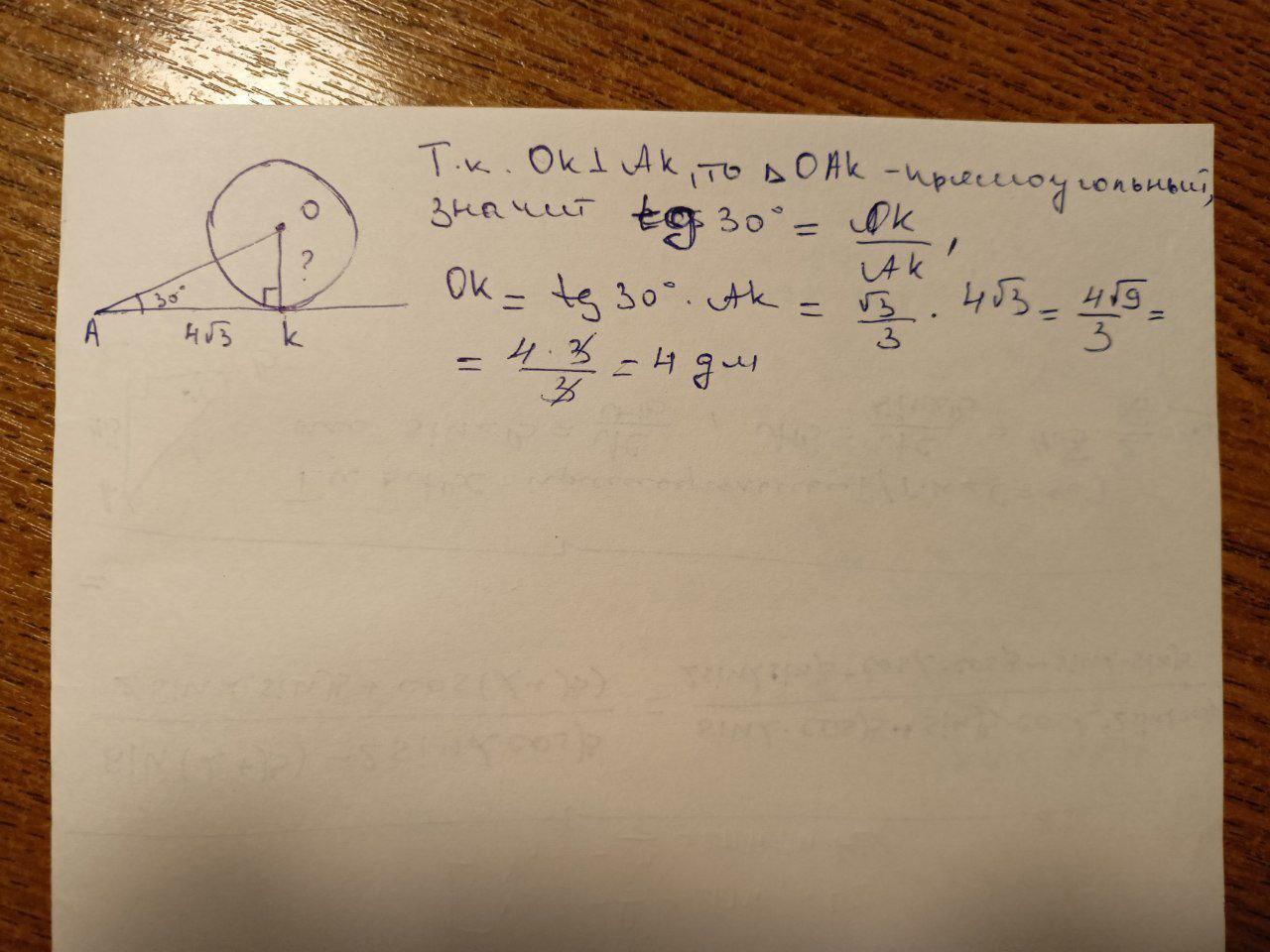 вычисли радиус окружности, если отрезок касательной AK = 4√3 дм и угол OAK = 30°