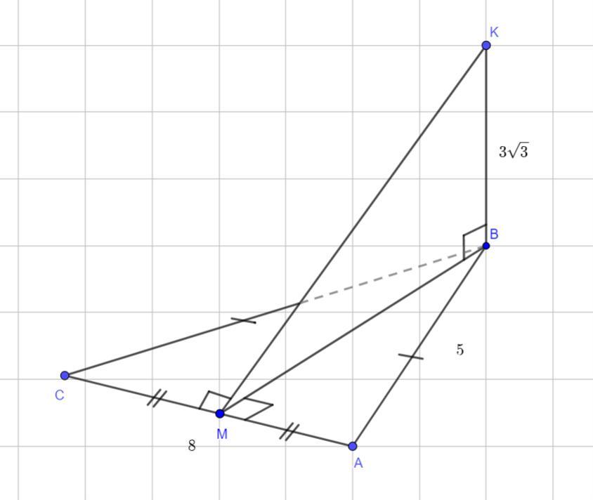 Из вершины В равнобедренного треугольника АВС (АВ=ВС) к плоскости треугольника проведен перпендикуляр ВК=3√3 см.