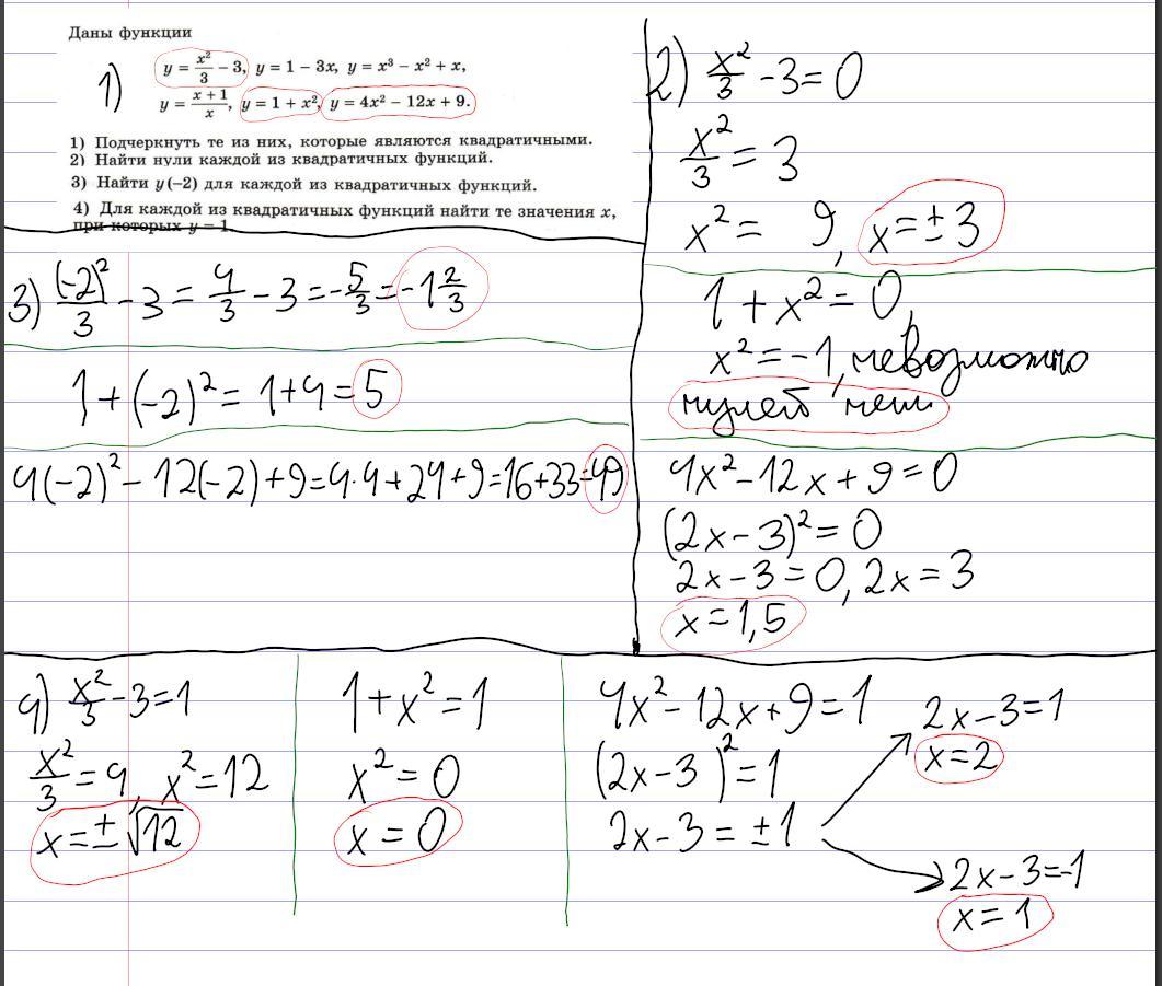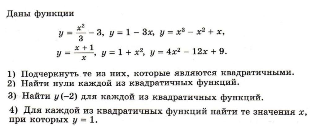 1) Подчеркнуть те из них, которые являются квадратичными. нули каждой из квадратичных функций. 3) Найти у (-2) для каждой из квадратичных функций. 4) Для каждой из квадратичных функций найти те значения х, при которых у = 1
