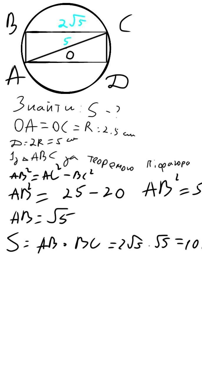 Найдите площадь прямоугольника (в см), вписанного в окружность с радиусом 2,5 см, если одна из его сторон равна 2√5см