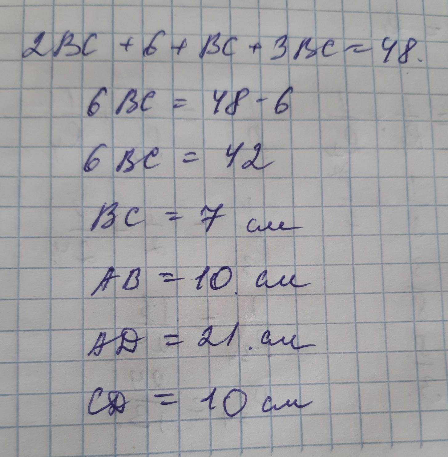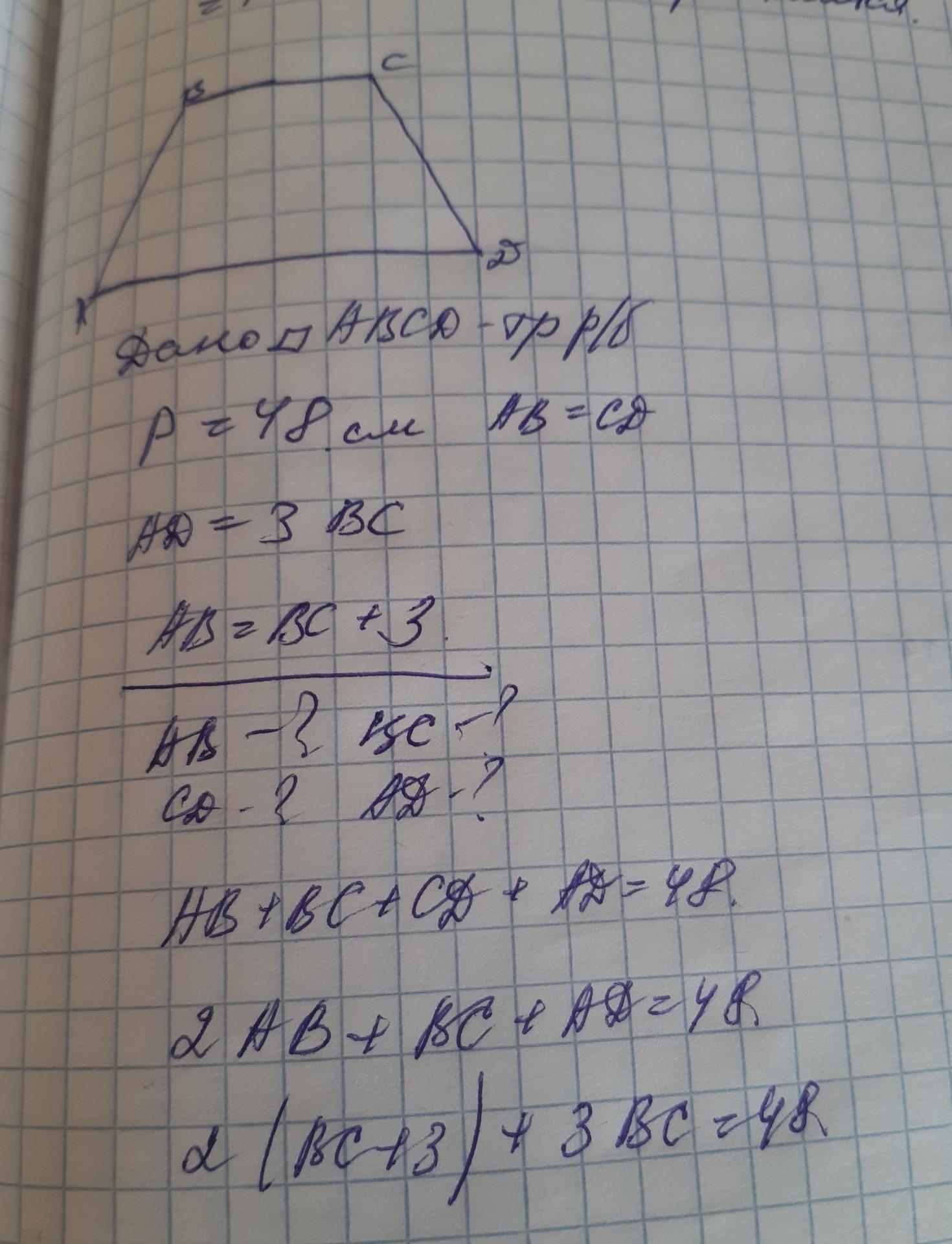Периметр рівнобічної трапеції дорівнює 48 см. Більша основа у 3 рази більша від меншої основи. Бічна сторона на 3 см більша, ніж менша основа. Обчисли довжини сторін трапеції.Срочно помогите пж