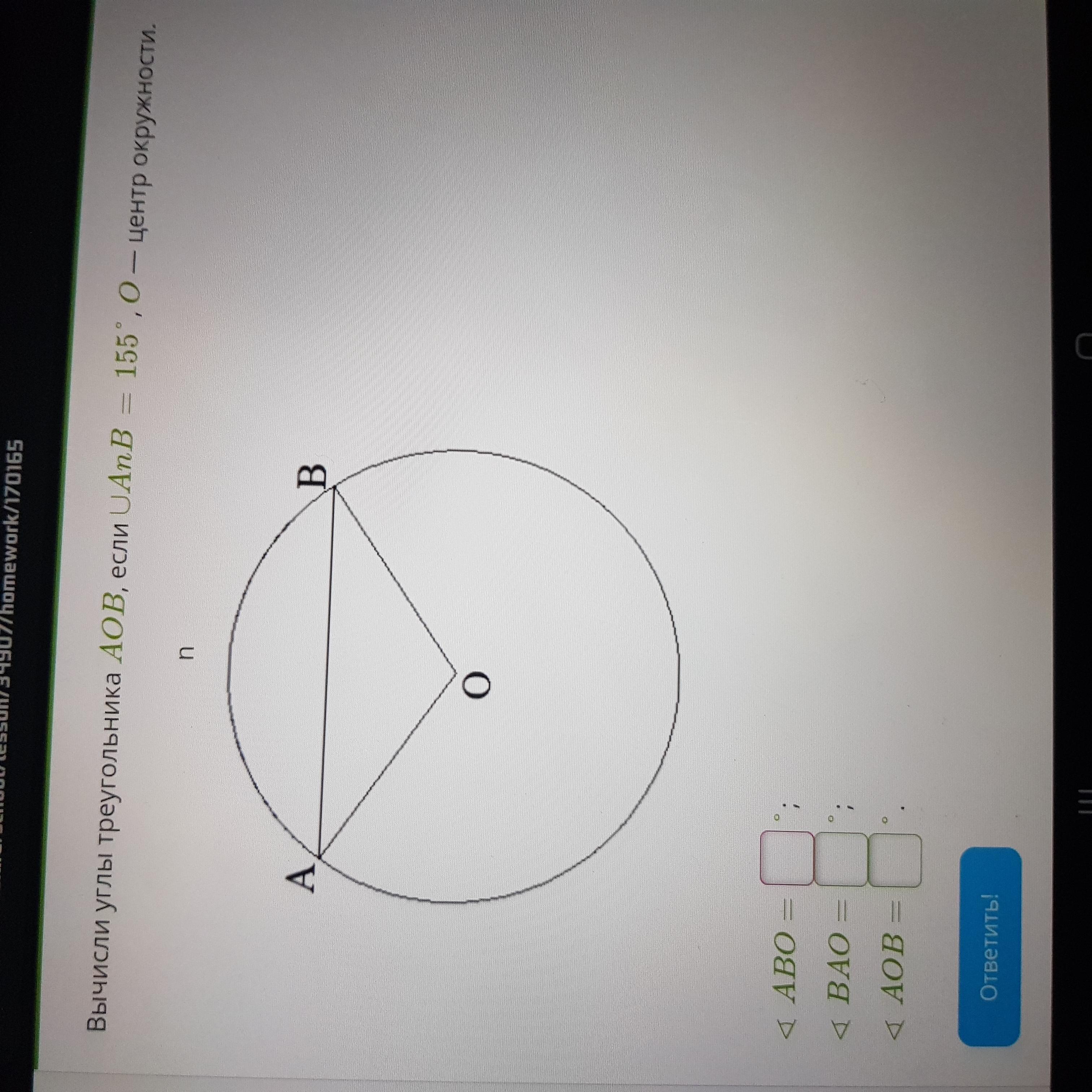 Вычисли углы треугольника AOB, если uAnB= 155", O — центр окружности.