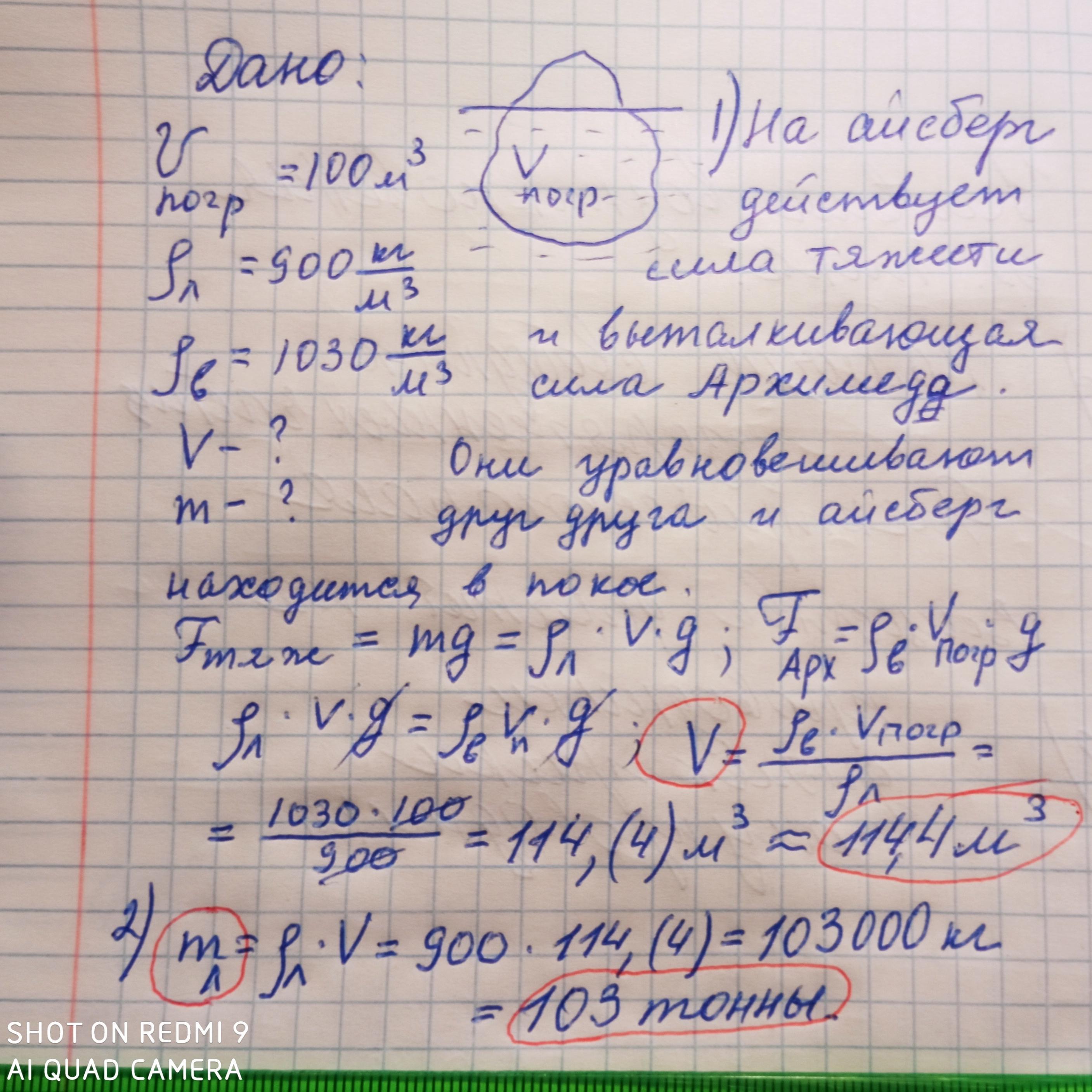 Объём погруженной в воду части айсберга составляет 100м³. Плотность льда равна 900м³кг, плотность солёной воды равна 1030м³кг. Необзодимо найти весь объём айсберга и его массу.