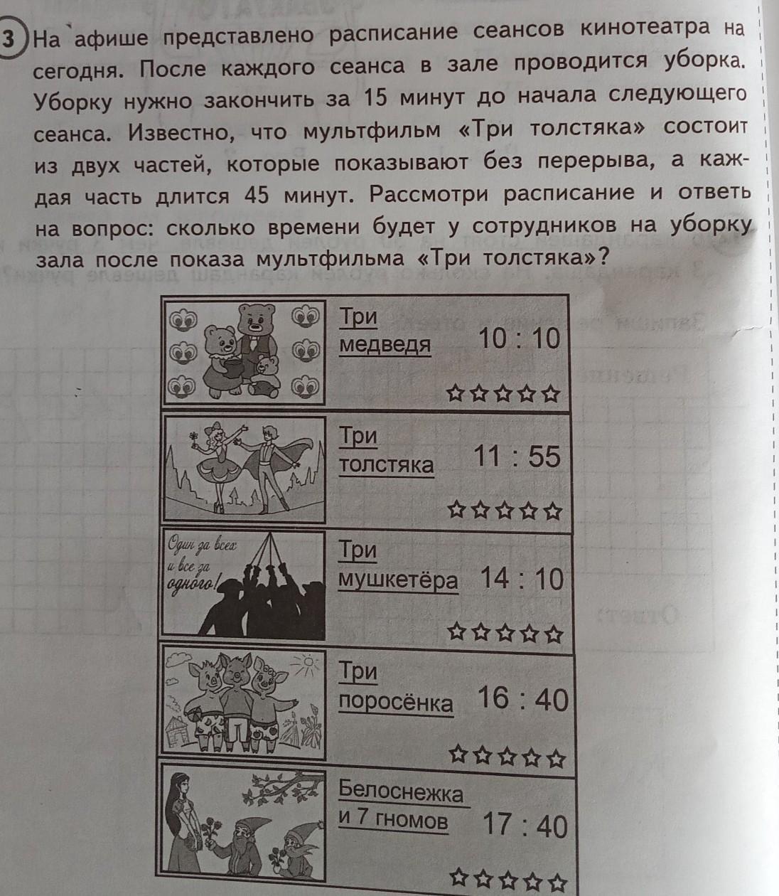 3) Так как уборка по условию должна закончится за 15 минут до начала сеанса, то времени на уборку будет: