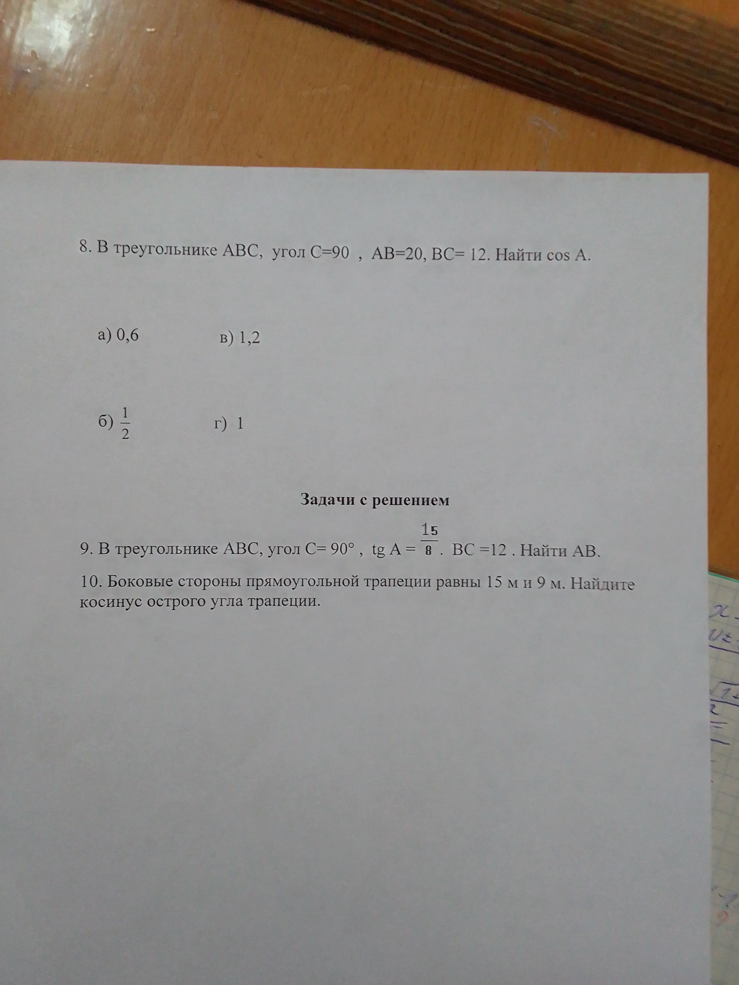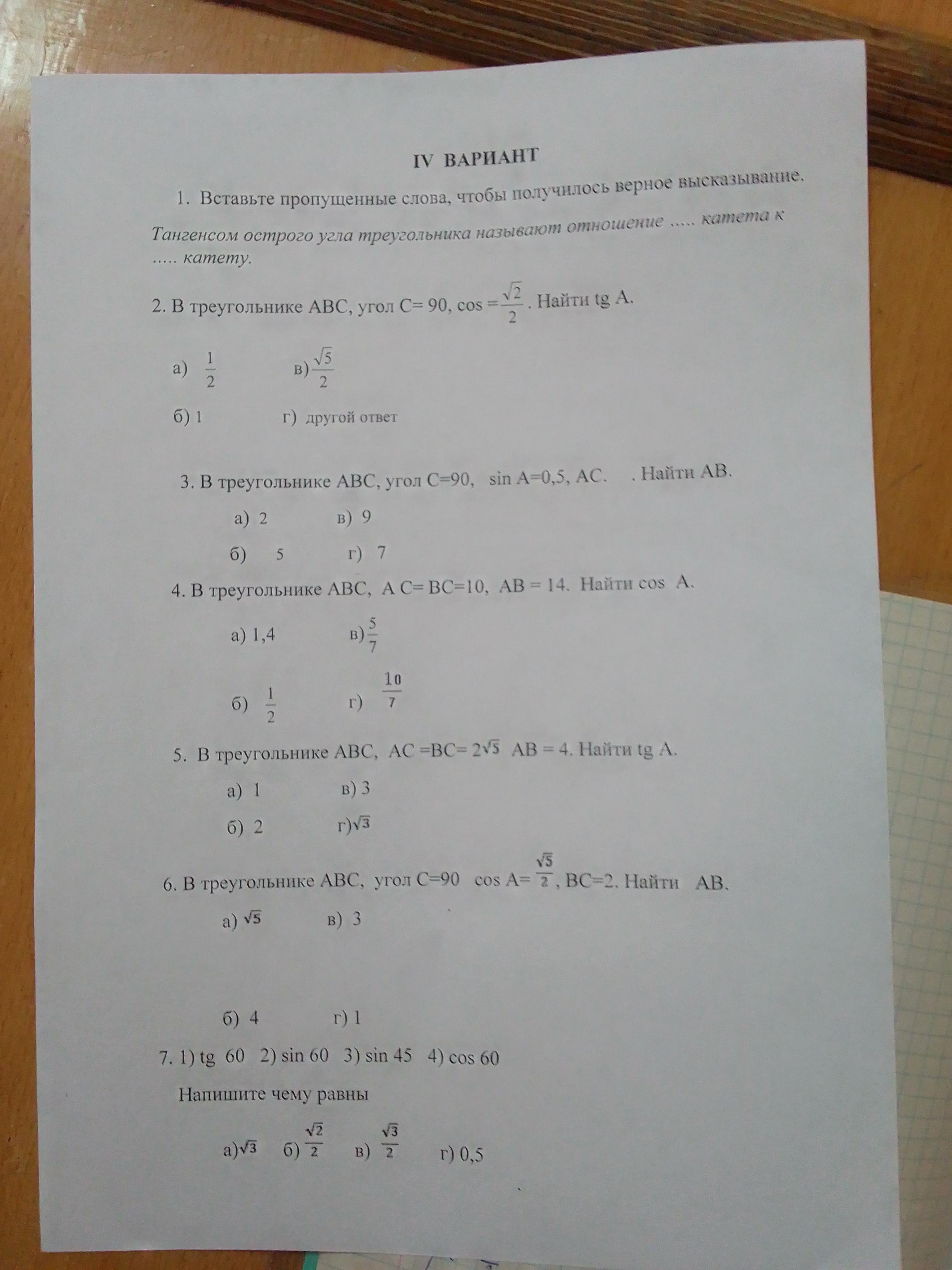 7.1) tg 60°-a)√3 2)sin 60°-в) √3/2 3)sin 45°-б) √2/2 4)cos 60°-г)0,5
