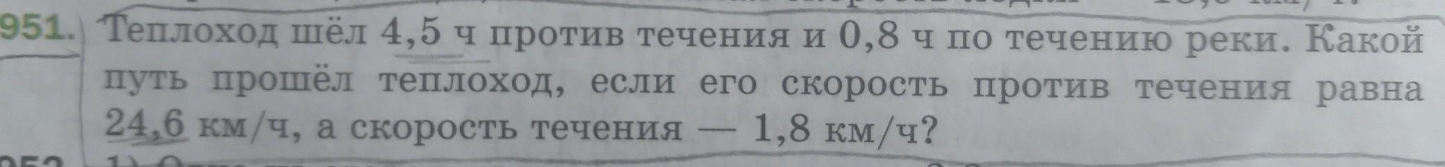 951. Теплоход шёл 4,5ч против течения и 0,8ч по течению реки. Какой путь прошёл теплоход, если его скорость против течения равна 24,6 км/ч, а скорость течения 1,8 км/ч?