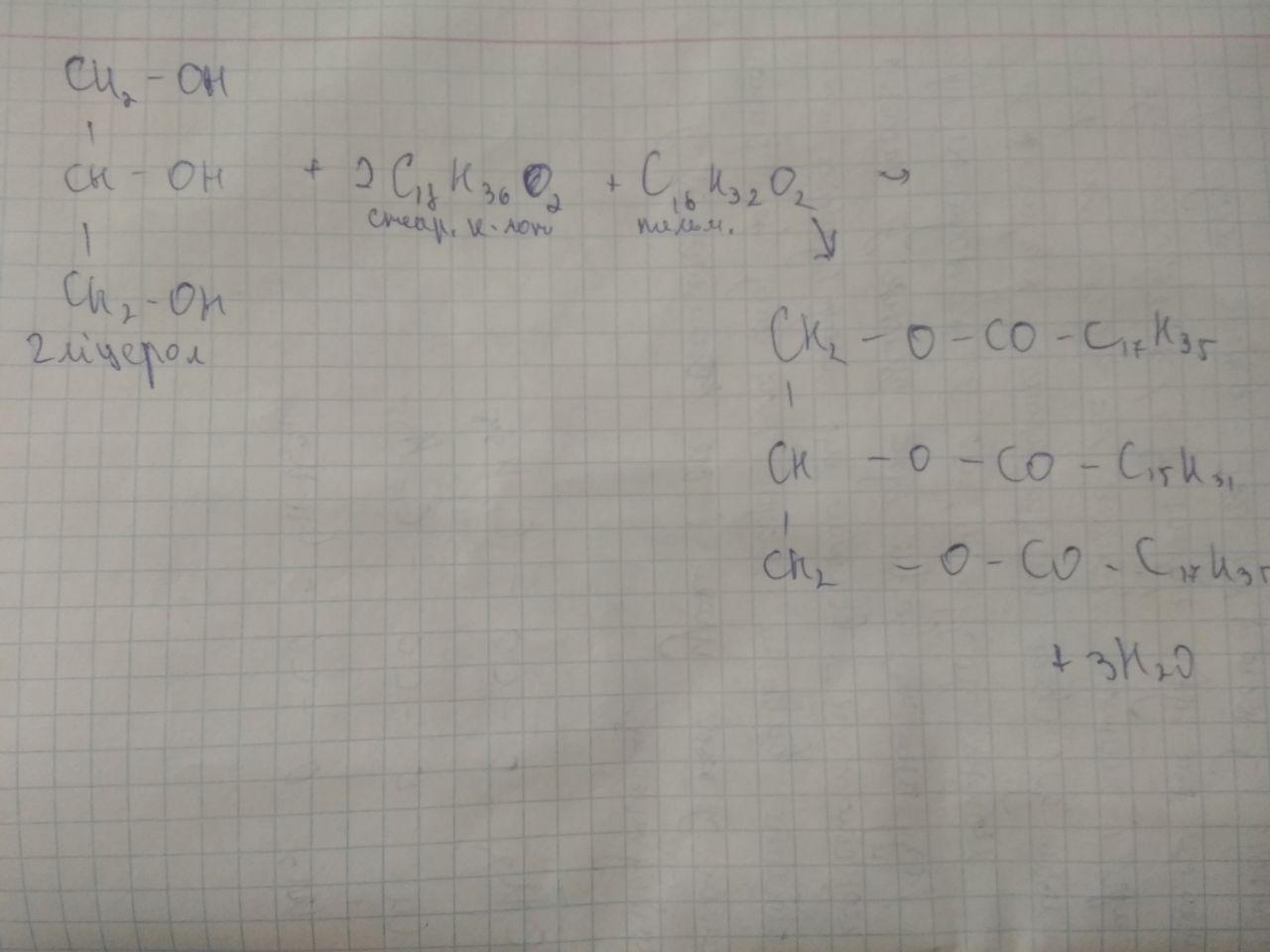 составьте уравнения реакции получения жира из одной молекулы пальмитиновой и двух молекул стериновой кислоты, подпишите все вещества