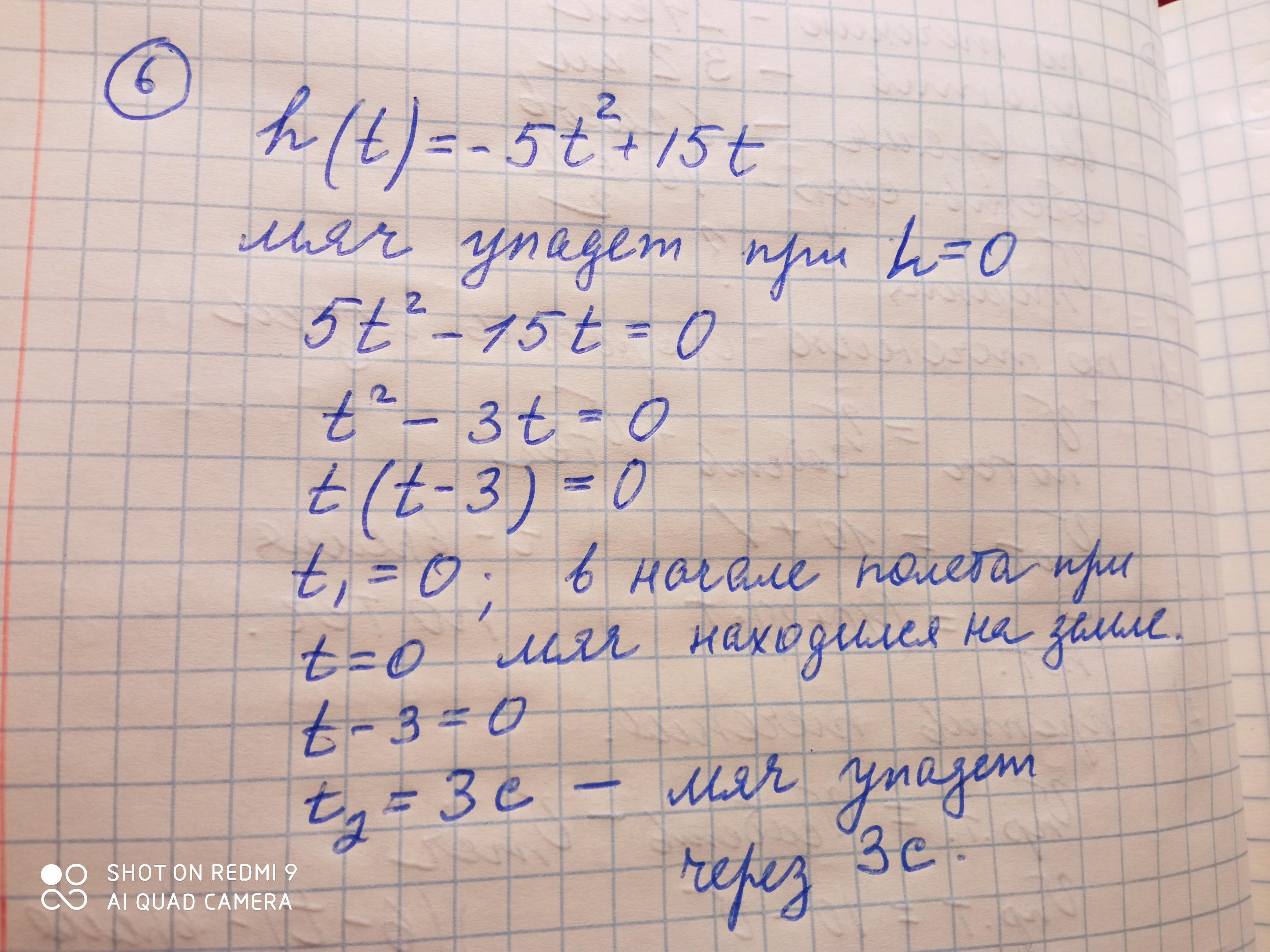 5. / 5 баллов / Лодка проплыла 24 км по течению и 32 км против течения. На всю поездку ушло 6 часов. Какова скорость течения, если скорость лодки 10 км/ч? 6. / 4 балла / Игрок ударил ногой по мячу вверх. Высота полета мяча над землей характеризуется формулой h(t)=-5t²+15t. Где h — высота (метры), 7 — время (секунды). Через сколько секунд мяч падает на землю?