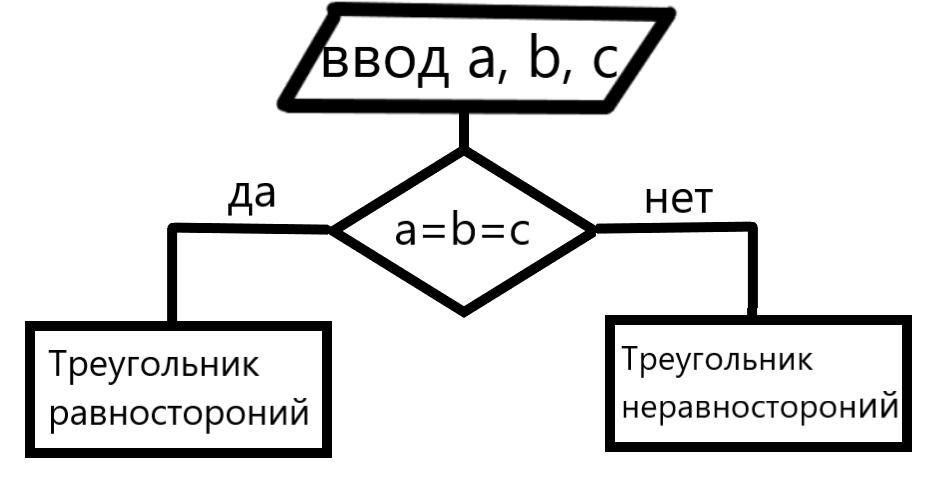 На блок-схеме забыл добавить "Начало" и "Конец" и команду "Вывод" перед треугольником.