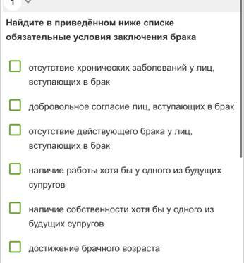 Ответ: 2) добровольное согласие лиц, вступающих в брак, 3) отсутствие действующего брака у лиц, вступающих в брак, 6) достижение брачного возраста