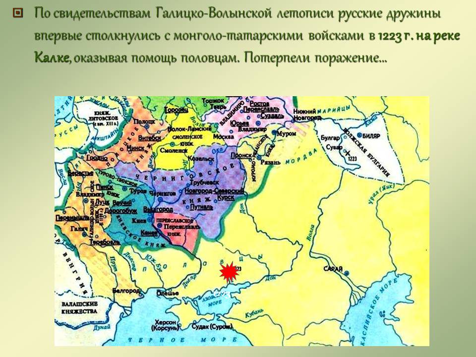2)Найдите и надпишите место первой встречи русских войск с монголо-татарскими завоевателями........ПЛИЗЗ ЗАРАНЕЕ СПАСИБО! 49 БАЛЛОВ!!!!