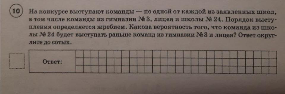 Нас интересует количество способов, когда школа выступает раньше лицея и гимназии. Их всего два (они подчёркнуты). Поэтому, вероятность данного события равна