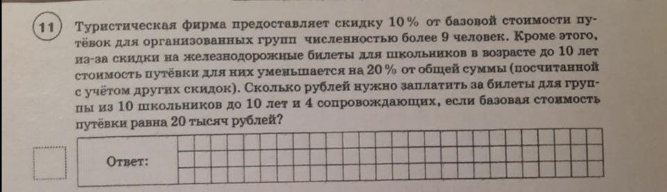3) 20000*(100%-10%):100%=20000*0,9=18000 (руб.) - цена путевки на одного человека
