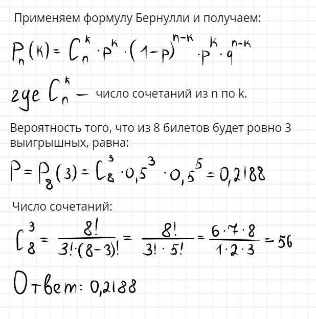 вероятность того, что лотерейный билет выигрышный ровна 0,5 чему ровна вероятность того, что из 8 купленных наугад лотерейных билетов 3 окажутся выигрышными?