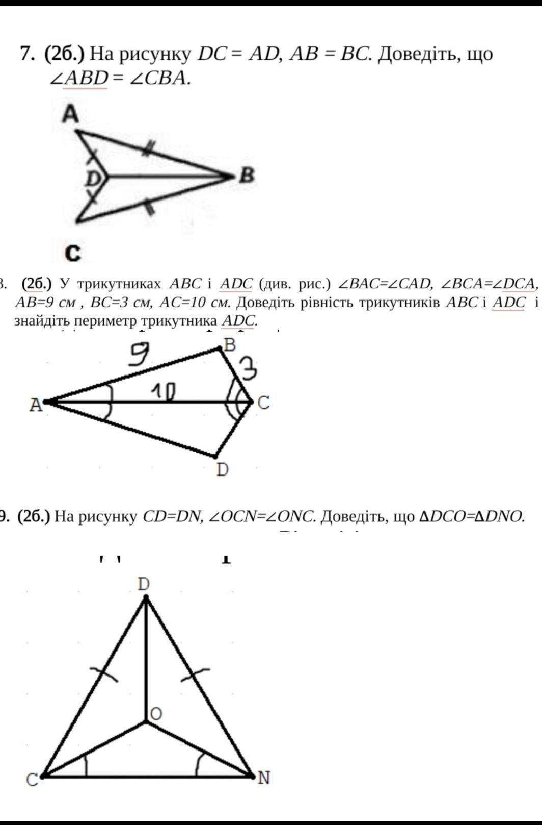 1. Так как AD = DC, AB=CB, а DB – общая, то эти треугольники равны (по 3 признаку). Значит угол ABD = углу CBA как составляющие равных треугольников.