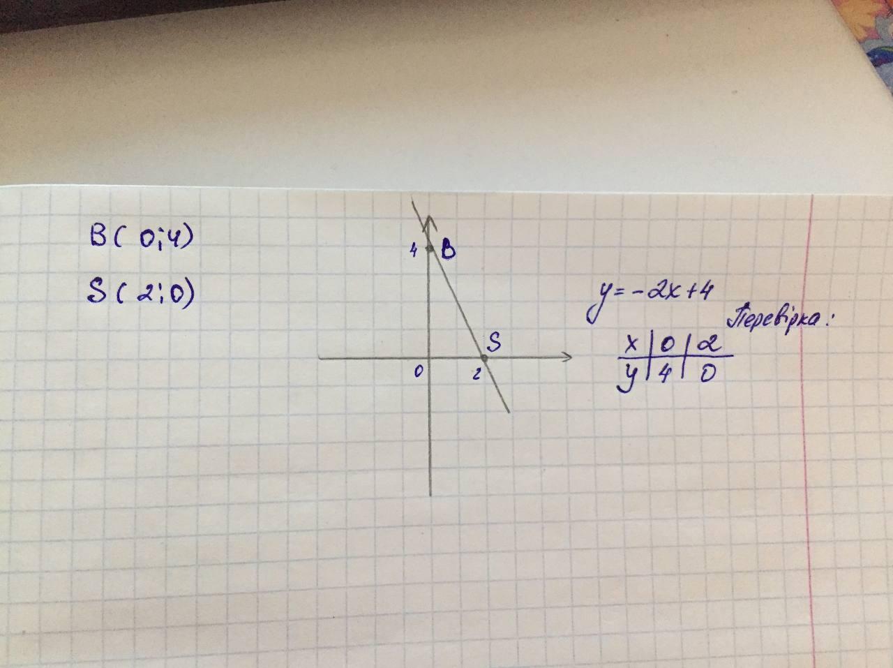 Задати формулою лінійну функцію, графік якої перетинає осі координат у точках В (0; 4), S(2; 0)
