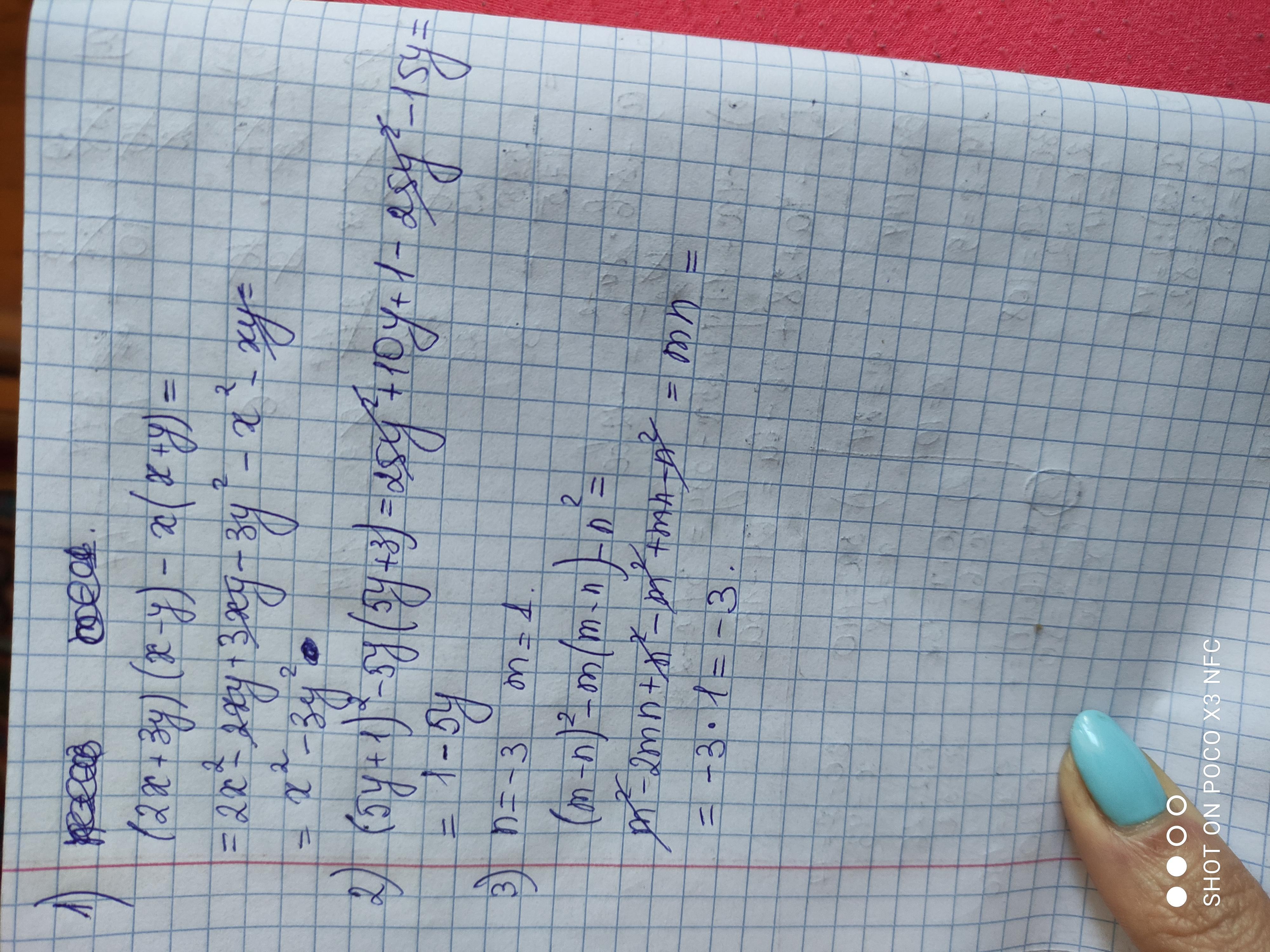 Упростите выражения (2x+3y)(x-y)-x(x+y), (5y+1) ²-5y(5y+3), (m-n) ²-m(m-n) -n² при n = -3, m=1, с решением