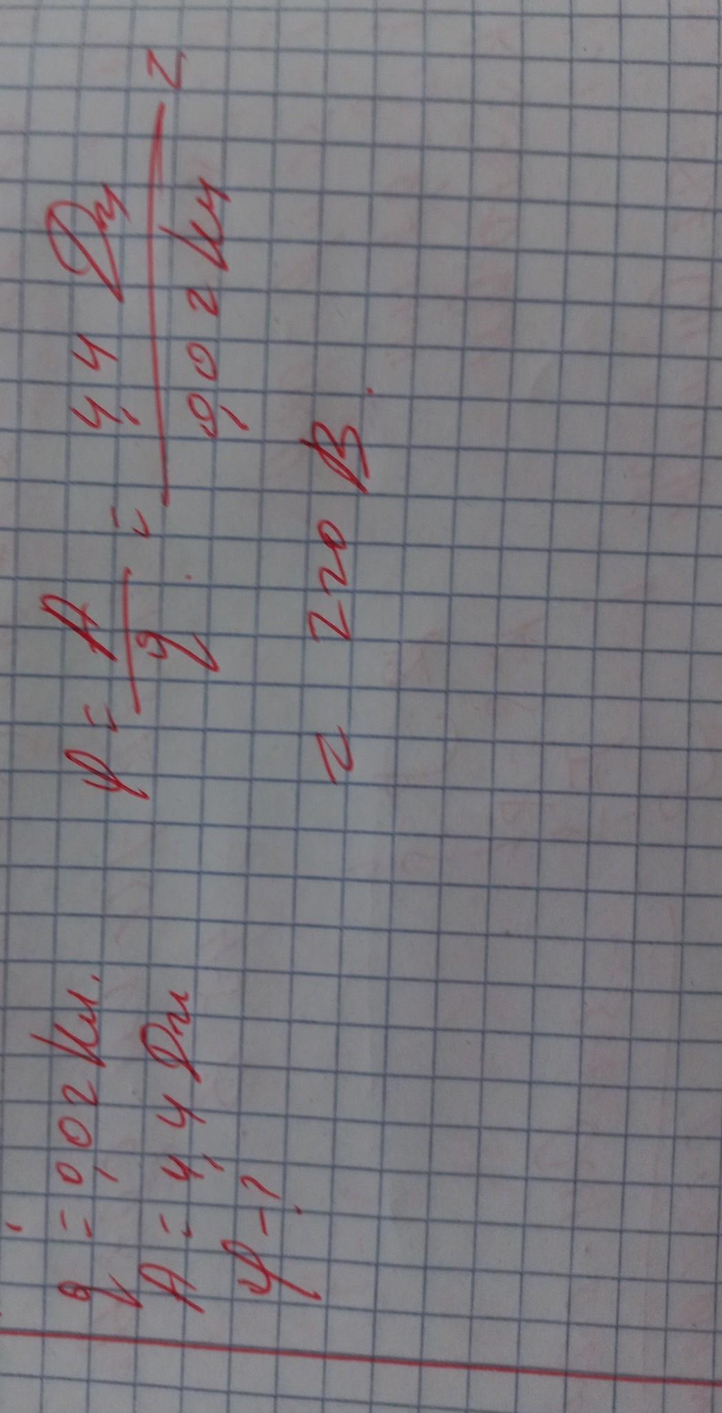 Яку різницю потенціалів має електричне поле, якщо воно переносить заряд 0,02 Кл, виконуючи при цьому роботу 4,4 Дж ?